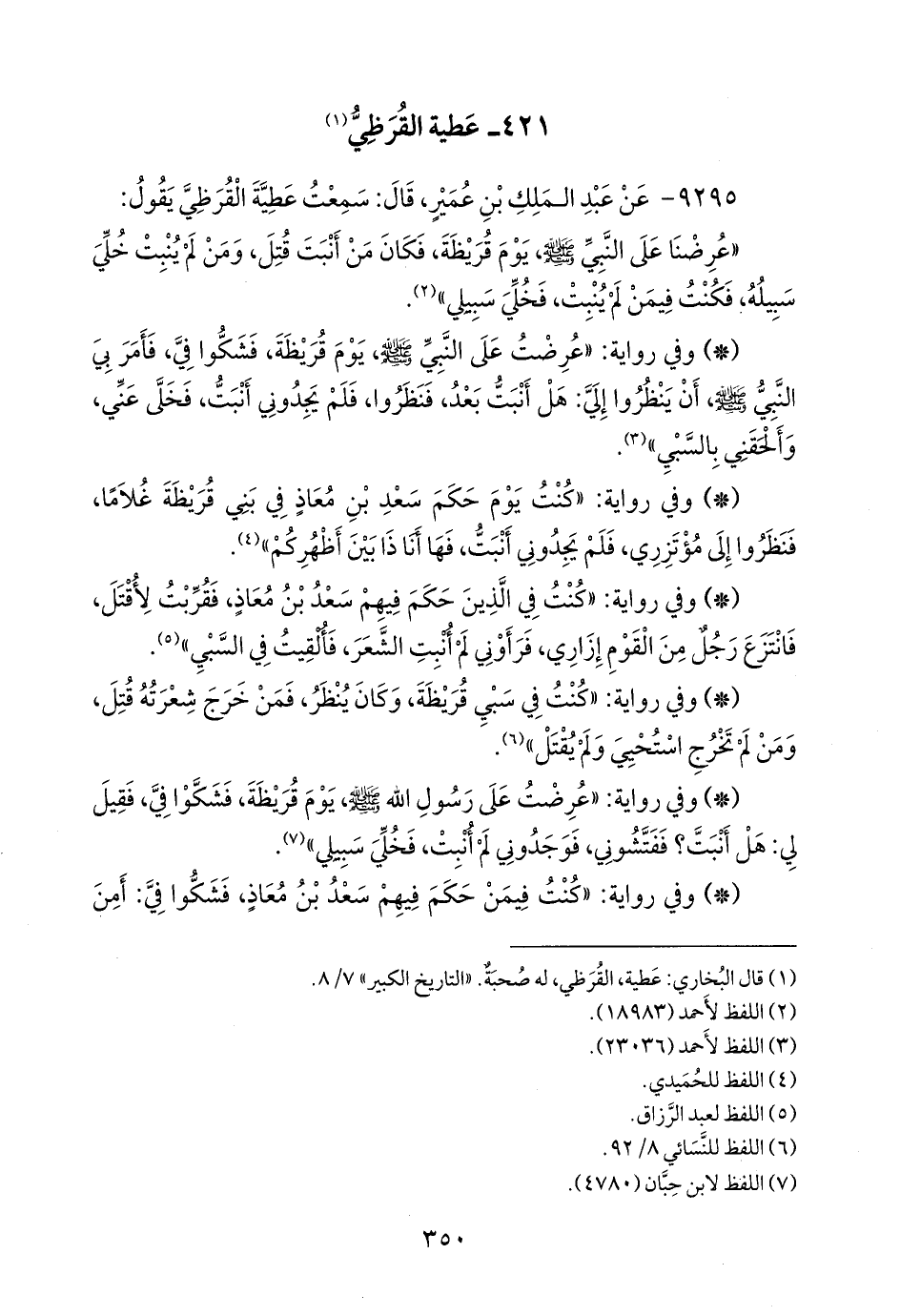 - وفي رواية: «كنت في الذين حكم فيهم سعد بن معاذ، فقربت لأقتل، فانتزع رجل من القوم إزاري، فرأوني لم أنبت الشعر، فألقيت في السبي» (¬٥).