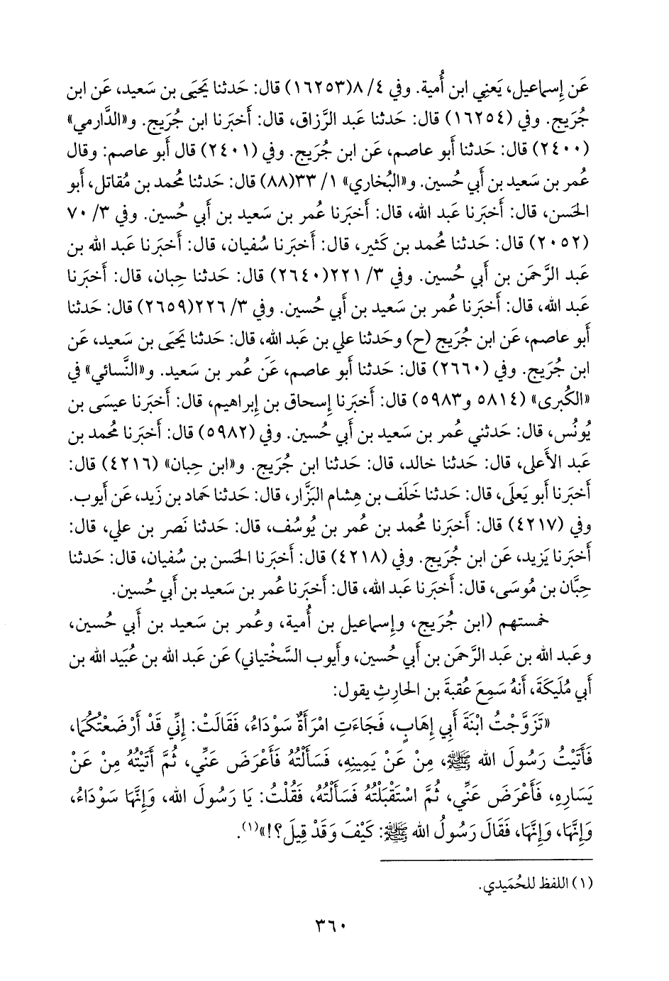 خمستهم (عبد الملك بن جُريج، وإسماعيل بن أُمية، وعمر بن سعيد بن أبي حسين، وعبد الله بن عبد الرَّحمَن بن أبي حسين، وأيوب السَّخْتِياني) عن عبد الله بن عُبيد الله بن أَبي مُليكة، أنه سمع عقبة بن الحارث يقول: