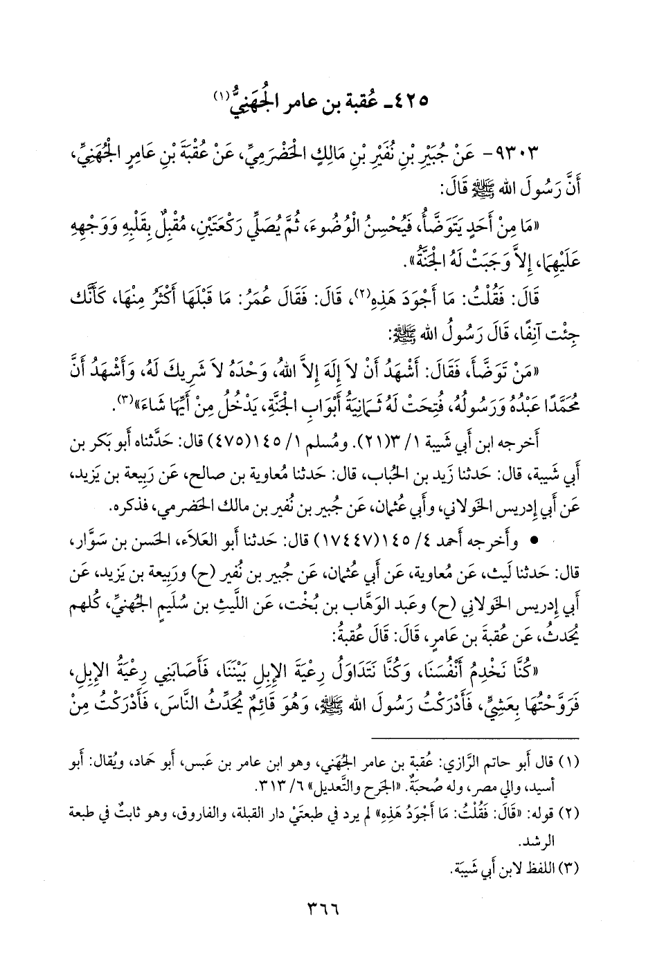 - وأَخرجه أَبو داود (٩٠٦) قال: حدثنا عثمان بن أبي شيبة، حدثنا زيد بن الحُبَاب، حدثنا معاوية بن صالح، عن ربيعة بن يزيد، عن أبي إدريس الخَولاني، عن جبير بن نفير الحضرمي، عن عقبة بن عامر الجهني، أن رسول الله صَلى الله عَليه وسَلم قال: