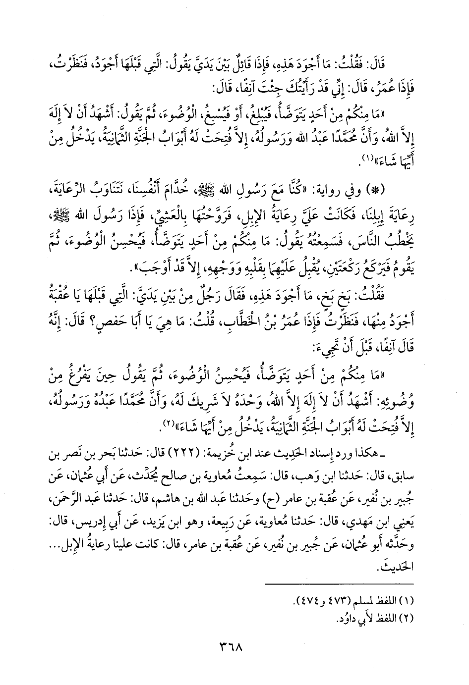 «ما منكم من أَحد يتوضأُ فيبلغ الوضوء، ثم يقول: أَشهد أَن لا إِله إِلا الله، وأَن محمدا عبد الله ورسوله، إِلا فتحت له أَبواب الجنة، يدخل من أَيها شاء» (¬٢).
