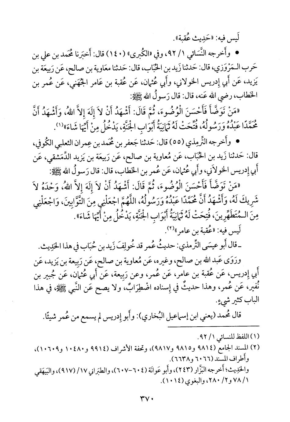 - في إسناد هذا الحديث: معاوية بن صالح، عن ربيعة بن يزيد، عن أَبي إِدريس الخَولاني، عن عقبة بن عامر، وعن أَبي عثمان، عن جبير بن نفير، عن عقبة بن عامر.