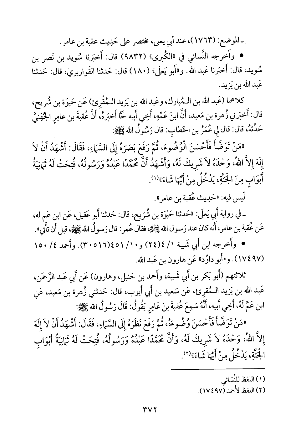 كلاهما (عبد الله بن المبارك، وعبد الله بن يزيد المُقرِئ) عن حَيْوَة بن شُرَيح، قال: أخبرني زَهرة بن مَعبد، أن ابن عمه، أخي أبيه لحا أخبره، أن عقبة بن عامر الجهني حدثه، قال: قال لي عمر بن الخطاب: قال رسول الله صَلى الله عَليه وسَلم: