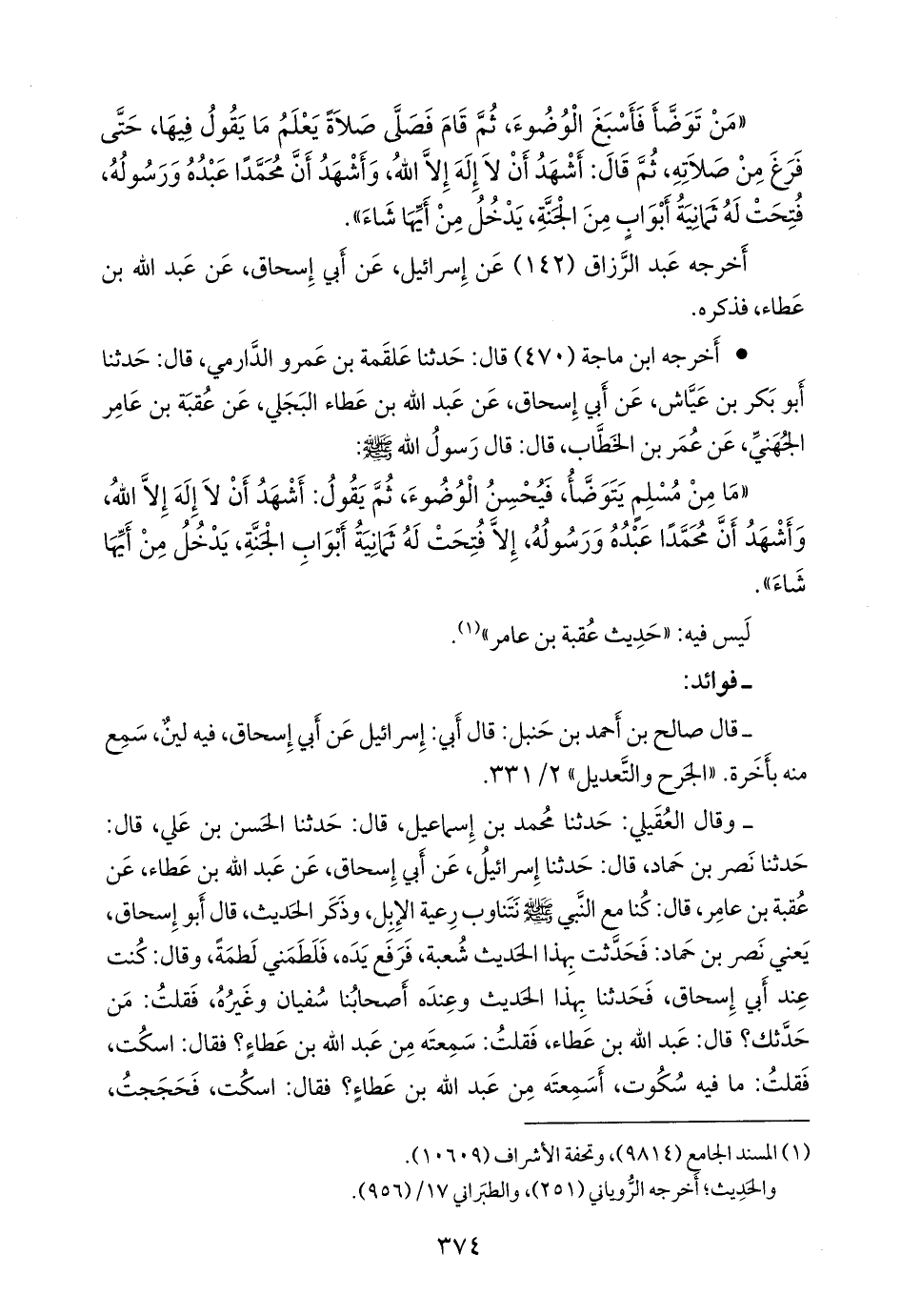 فرواه إسرائيل، وأَبو الأحوص، وعُبيدة بن مُعَتِّب، ومسعر، ويوسف بن إسحاق بن أبي إسحاق، وسلمة بن صالح الأحمر، وغيرهم عن أبي إسحاق، عن عبد الله بن عطاء، عن عقبة بن عامر.