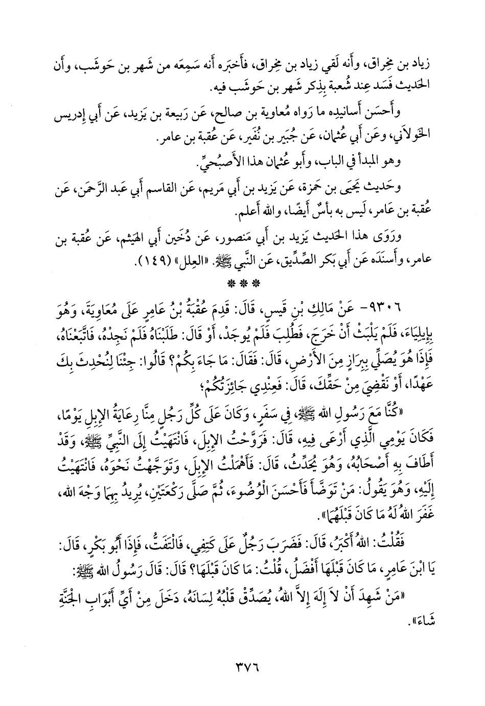٩٣٠٦ - عن مالك بن قيس، قال: قدم عقبة بن عامر على معاوية، وهو بإيلياء، فلم يلبث أن خرج، فطلب فلم يوجد، أو قال: طلبناه فلم نجده، فاتبعناه، فإذا هو يصلي ببراز من الأرض، قال: فقال: ما جاء بكم؟ قالوا: جئنا لنحدث بك عهدا، أو نقضي من حقك، قال: فعندي جائزتكم؛