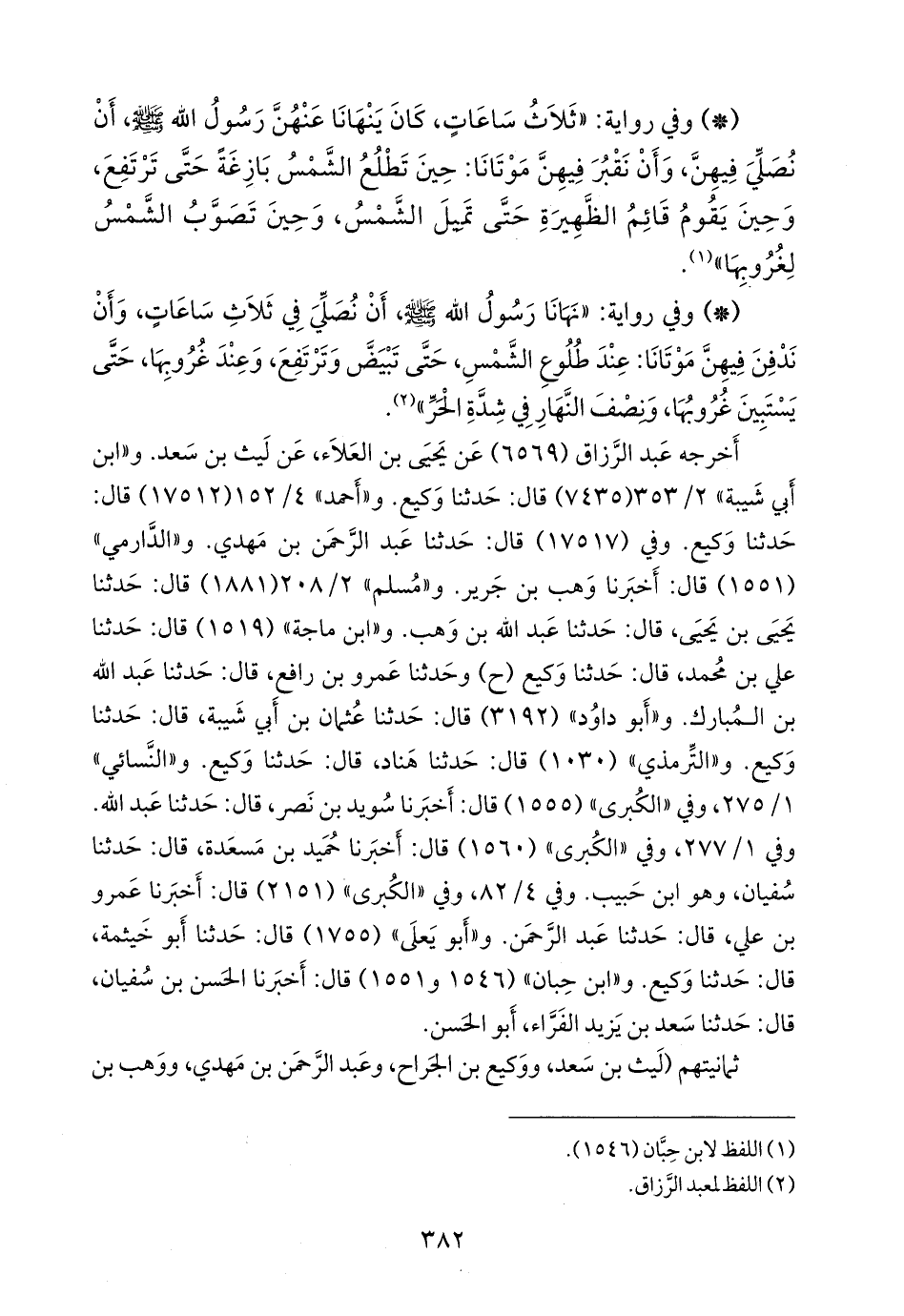 و «مسلم» ٢/ ٢٠٨ (١٨٨١) قال: حدثنا يحيى بن يحيى، قال: حدثنا عبد الله بن وهب. و «ابن ماجة» (١٥١٩) قال: حدثنا علي بن محمد، قال: حدثنا وكيع (ح) وحدثنا عَمرو بن رافع، قال: حدثنا عبد الله بن المبارك. و «أَبو داود» (٣١٩٢) قال: حدثنا عثمان بن أبي شيبة، قال: حدثنا وكيع. و «التِّرمِذي» (١٠٣٠) قال: حدثنا هَنَّاد، قال: حدثنا وكيع. و «النَّسَائي» ١/ ٢٧٥، وفي «الكبرى» (١٥٥٥) قال: أخبرنا سويد بن نصر، قال: حدثنا عبد الله. وفي ١/ ٢٧٧، وفي «الكبرى» (١٥٦٠) قال: أخبرنا حميد بن مَسعَدة، قال: حدثنا سفيان، وهو ابن حبيب. وفي ٤/ ٨٢، وفي «الكبرى» (٢١٥١) قال: أخبرنا عَمرو بن علي، قال: حدثنا عبد الرَّحمَن. و «أَبو يَعلى» (١٧٥٥) قال: حدثنا أَبو خيثمة، قال: حدثنا وكيع. و «ابن حِبَّان» (١٥٤٦ و ١٥٥١) قال: أخبرنا الحسن بن سفيان، قال: حدثنا سعد بن يزيد الفراء، أَبو الحسن.