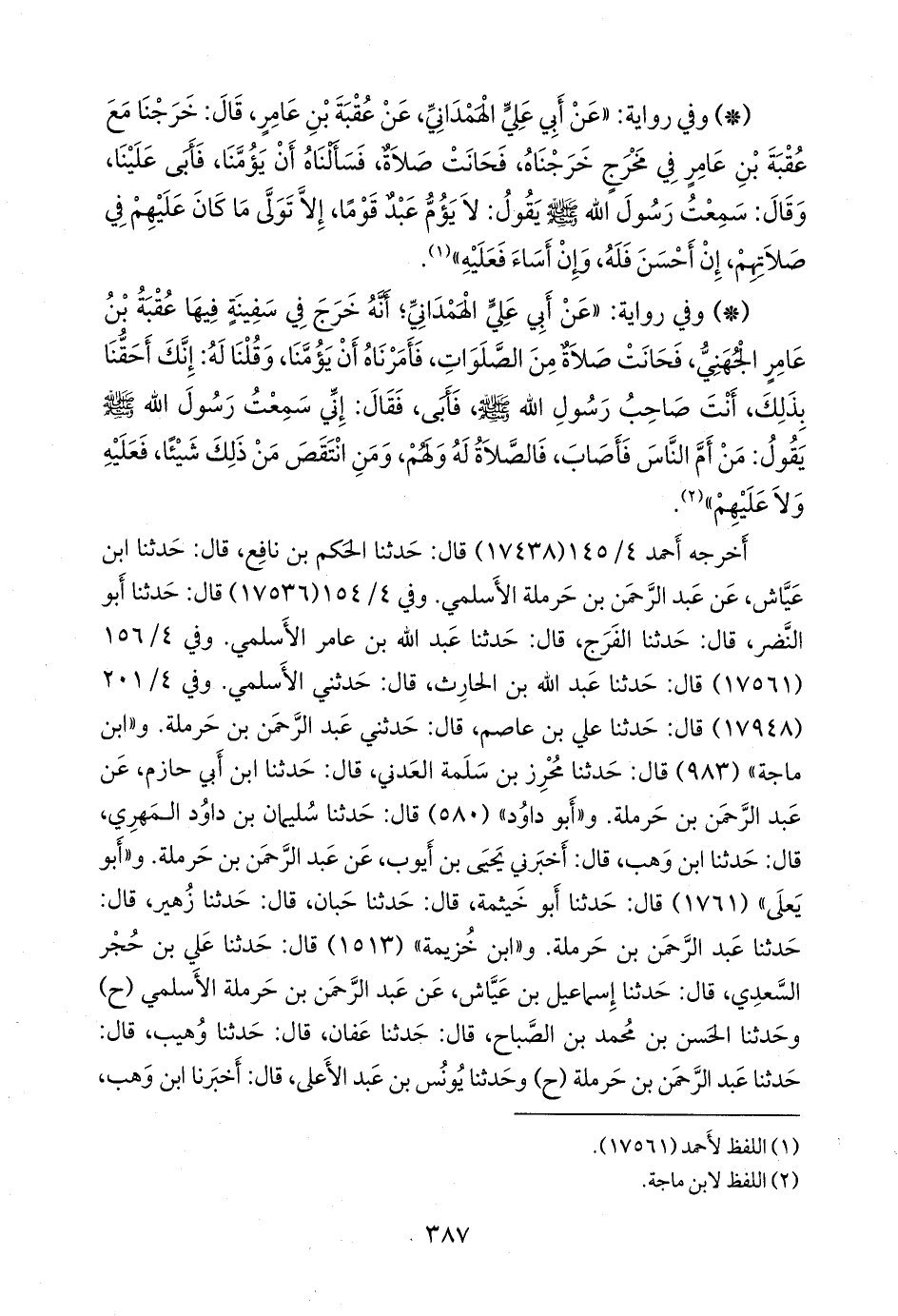 - وفي رواية: «عن أبي علي الهمداني؛ أنه خرج في سفينة فيها عقبة بن عامر الجهني, فحانت صلاة من الصلوات، فأمرناه أن يؤمنا، وقلنا له: إنك أحقنا بذلك، أنت صاحب رسول الله صَلى الله عَليه وسَلم فأبى، فقال: إني سمعت رسول الله صَلى الله عَليه وسَلم يقول: من أم الناس فأصاب، فالصلاة له ولهم، ومن انتقص من ذلك شيئا، فعليه ولا عليهم» (¬١).