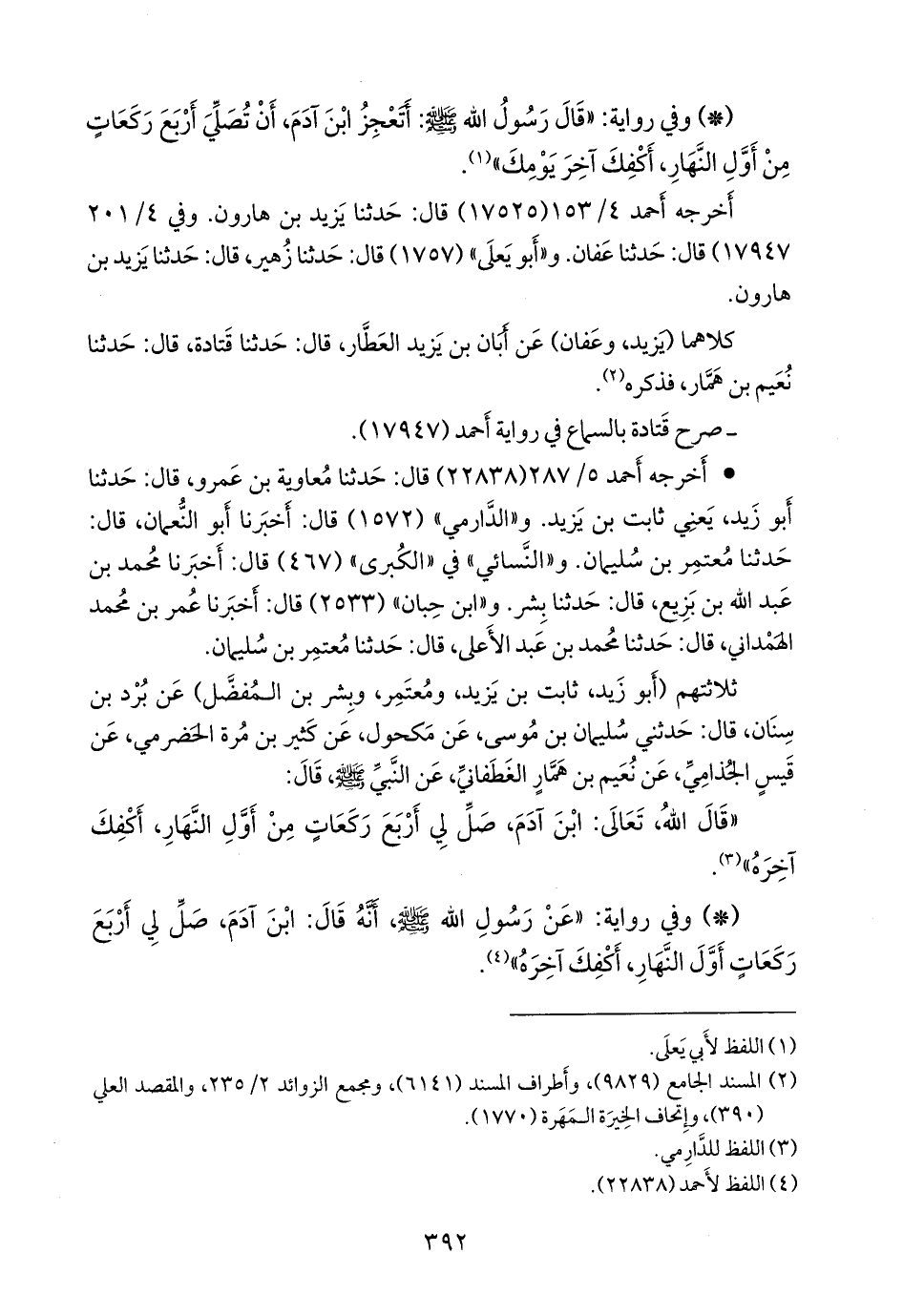 - وفي رواية: «عن رسول الله صَلى الله عَليه وسَلم أنه قال: ابن آدم، صل لي أربع ركعات أول النهار، أكفك آخره» (¬٢).