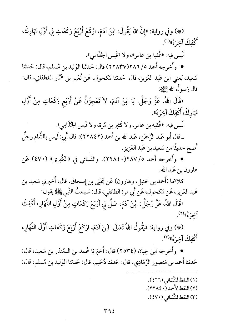 «عن ربه، تبارك وتعالى، أنه قال: يا بن آدم، صل لي أربع ركعات أول النهار، أكفك آخره».