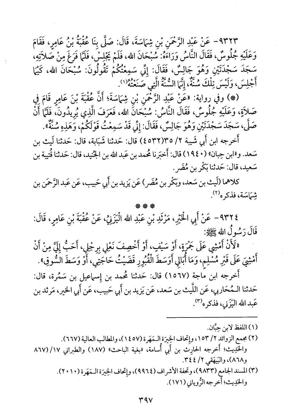 ٩٣٢٣ - عن عبد الرَّحمَن بن شِمَاسة، قال: صلى بنا عقبة بن عامر، فقام وعليه جلوس، فقال الناس وراءه: سبحان الله، فلم يجلس، فلما فرغ من صلاته، سجد سجدتين وهو جالس، فقال: إني سمعتكم تقولون: سبحان الله، كيما أجلس، وليس تلك سنة، إنما السنة التي صنعته (¬١).