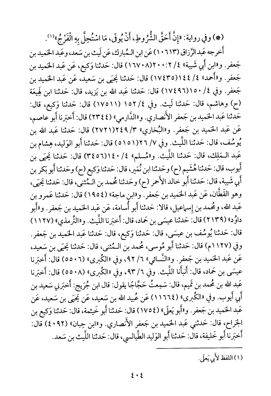 وفي ٤/ ١٥٢ (١٧٥١١) قال: حدثنا وكيع، قال: حدثنا عبد الحميد بن جعفر الأَنصاري. و «الدَّارِمي» (٢٣٤٤) قال: أخبرنا أَبو عاصم، عن عبد الحميد بن جعفر. و «البخاري» ٣/ ١٩٠ (٢٧٢١) قال: حدثنا عبد الله بن يوسف، قال: حدثنا الليث. وفي ٧/ ٢٠ (٥١٥١) قال: حدثنا أَبو الوليد هشام بن عبد الملك، قال: حدثنا الليث. و «مسلم» ٤/ ١٤٠ (٣٤٥٦) قال: حدثنا يحيى بن أيوب، قال: حدثنا هُشيم (ح) وحدثنا ابن نُمير، قال: حدثنا وكيع (ح) وحدثنا أَبو بكر بن أبي شيبة، قال: حدثنا أَبو خالد الأحمر (ح) وحدثنا محمد بن المثنى، قال: حدثنا يحيى، وهو القطان، عن عبد الحميد بن جعفر. و «ابن ماجة» (١٩٥٤) قال: حدثنا عَمرو بن عبد الله، ومحمد بن إسماعيل، قالا: حدثنا أَبو أُسامة، عن عبد الحميد بن جعفر. و «أَبو داود» (٢١٣٩) قال: حدثنا عيسى بن حماد، قال: أخبرنا الليث. و «التِّرمِذي» (١١٢٧) قال: حدثنا يوسف بن عيسى، قال: حدثنا وكيع، قال: حدثنا عبد الحميد بن جعفر. وفي (١١٢٧ م) قال: حدثنا أَبو موسى، محمد بن المثنى، قال: حدثنا يحيى بن سعيد، عن عبد الحميد بن جعفر. و «النَّسَائي» ٦/ ٩٢، وفي «الكبرى» (٥٥٠٦) قال: أخبرنا عيسى بن حماد، قال: أنبأنا الليث. وفي ٦/ ٩٣، وفي «الكبرى» (٥٥٠٨) قال: أخبرنا عبد الله بن محمد بن تميم، قال: سمعت حجاجا يقول: قال ابن جُريج: أخبرني سعيد بن أَبي أَيوب.
