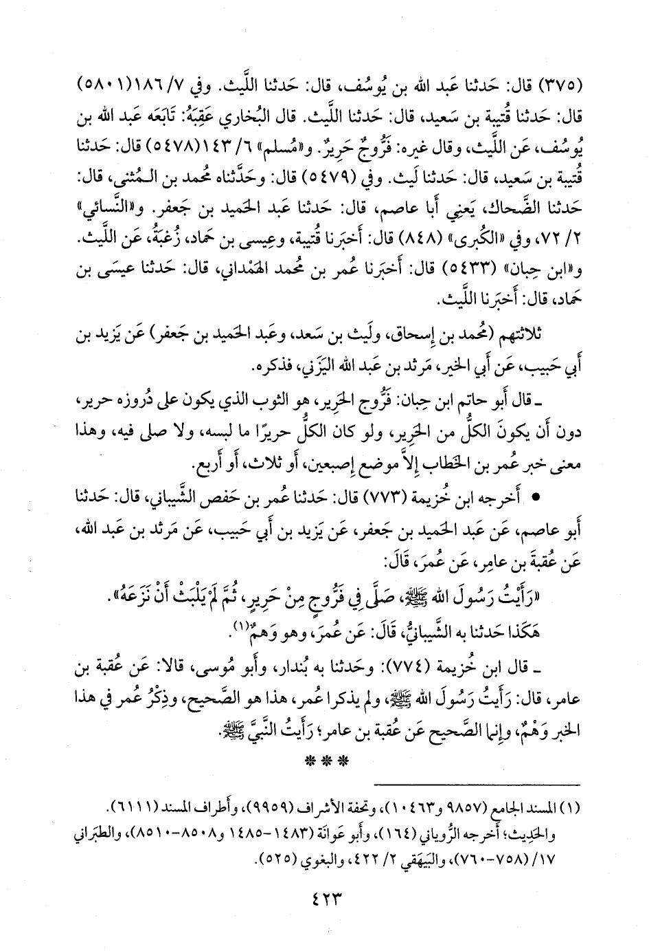 - قال أَبو حاتم بن حبان: فروج الحرير، هو الثوب الذي يكون على دروزه حرير، دون أن يكون الكل من الحرير، ولو كان الكل حريرا ما لبسه، ولا صلى فيه، وهذا معنى خبر عمر بن الخطاب إلا موضع إصبعين، أو ثلاث، أو أربع.