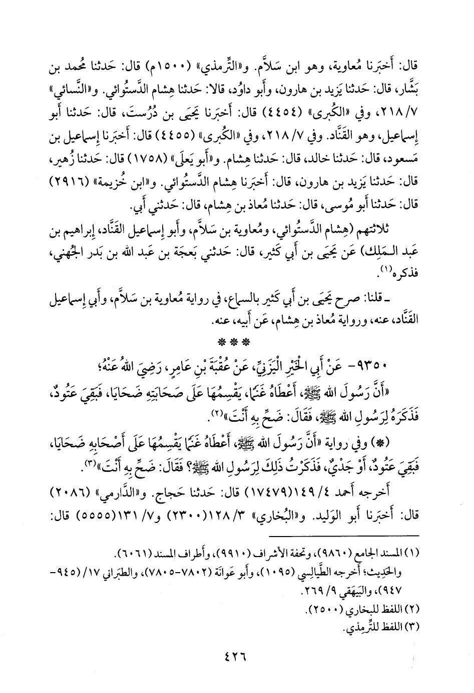 و «التِّرمِذي» (١٥٠٠ م) قال: حدثنا محمد بن بشار، قال: حدثنا يزيد بن هارون، وأَبو داود، قالا: حدثنا هشام الدَّستوائي. و «النَّسَائي» ٧/ ٢١٨، وفي «الكبرى» (٤٤٥٤) قال: أخبرنا يحيى بن دُرُست، قال: حدثنا أَبو إسماعيل، وهو القناد. وفي ٧/ ٢١٨، وفي «الكبرى» (٤٤٥٥) قال: أخبرنا إسماعيل بن مسعود، قال: حدثنا خالد، قال: حدثنا هشام. و «أَبو يَعلى» (١٧٥٨) قال: حدثنا زهير، قال: حدثنا يزيد بن هارون، قال: أخبرنا هشام الدَّستوائي. و «ابن خزيمة» (٢٩١٦) قال: حدثنا أَبو موسى، قال: حدثنا معاذ بن هشام، قال: حدثني أبي.