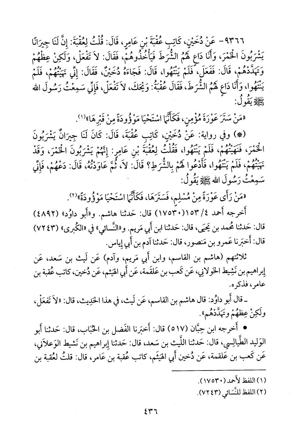 ٩٣٦٦ - عن دخين، كاتب عقبة بن عامر، قال: قلت لعقبة: إن لنا جيرانا يشربون الخمر، وأنا داع لهم الشرط فيأخذوهم، فقال: لا تفعل، ولكن عظهم وتهددهم، قال: ففعل، فلم ينتهوا، قال: فجاءه دخين، فقال: إني نهيتهم، فلم ينتهوا، وأنا داع لهم الشرط، فقال عقبة: ويحك، لا تفعل، فإني سمعت رسول الله صَلى الله عَليه وسَلم يقول: