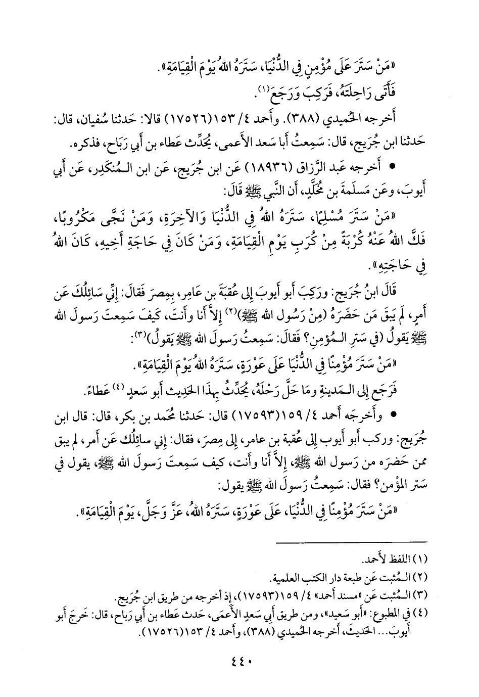 - وأخرجه أحمد (١٧٥٩٣) قال: حدثنا محمد بن بكر، قال: قال ابن جُريج: وركب أَبو أيوب إلى عقبة بن عامر، إلى مصر، فقال: إني سائلك عن أمر، لم يبق ممن حضره من رسول الله صَلى الله عَليه وسَلم إلا أنا وأنت، كيف سمعت رسول الله صَلى الله عَليه وسَلم يقول في ستر المؤمن؟ فقال: سمعت رسول الله صَلى الله عَليه وسَلم يقول: