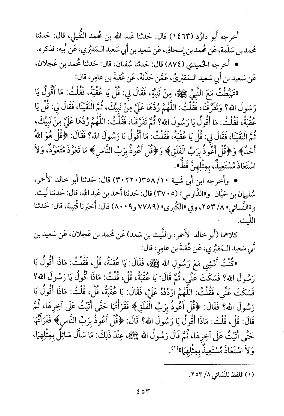 «كنت أمشي مع رسول الله صَلى الله عَليه وسَلم فقال: يا عقبة، قل، فقلت: ماذا أقول يا رسول الله؟ فسكت عني، ثم قال: يا عقبة، قل، قلت: ماذا أقول يا رسول الله؟ فسكت عني، فقلت: اللهم اردده علي، فقال: يا عقبة، قل، قلت: ماذا أقول يا رسول الله؟ فقال: {قل أعوذ برب الفلق} فقرأتها حتى أتيت على آخرها، ثم قال: قل، قلت: ماذا أقول يا رسول الله؟ قال: {قل أعوذ برب الناس} فقرأتها حتى أتيت على آخرها، ثم قال رسول الله صَلى الله عَليه وسَلم عند ذلك: ما سأل سائل بمثلهما، ولا استعاذ مستعيذ بمثلهما» (¬١).