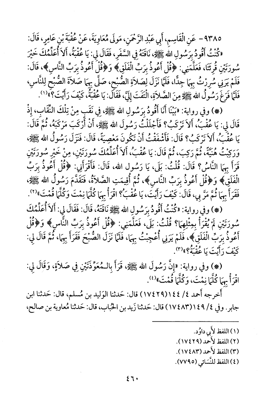 - وفي رواية: «كنت أقود برسول الله صَلى الله عَليه وسَلم ناقته، قال: فقال لي: ألا أعلمك سورتين لم يقرأ بمثلهما؟ قلت: بلى، فعلمني: {قل أعوذ برب الناس} و {قل أعوذ برب الفلق}، فلم يرني أعجبت بهما، فلما نزل الصبح فقرأ بهما، ثم قال لي: كيف رأيت يا عقبة؟» (¬٣).