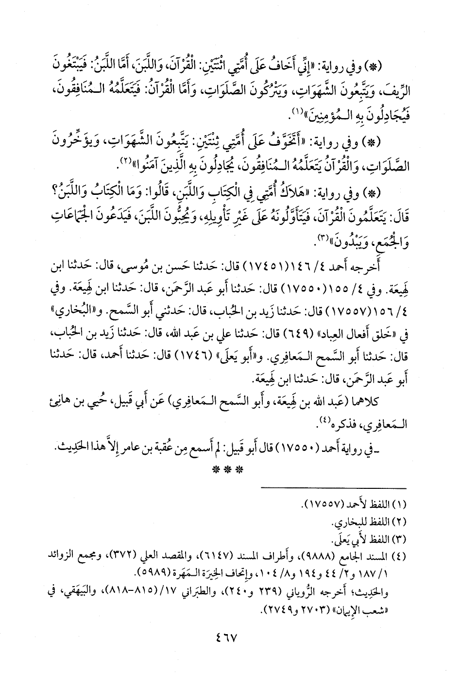 - وفي رواية: «هلاك أمتي في الكتاب واللبن، قالوا: وما الكتاب واللبن؟ قال: يتعلمون القرآن، فيتأولونه على غير تأويله، ويحبون اللبن، فيدعون الجماعات والجمع، ويبدون» (¬١).