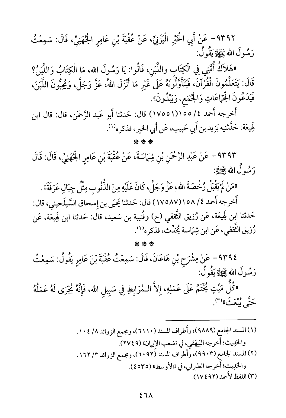 ٩٣٩٣ - عن عبد الرَّحمَن بن شِمَاسة، عن عقبة بن عامر الجهني، قال: قال رسول الله صَلى الله عَليه وسَلم: