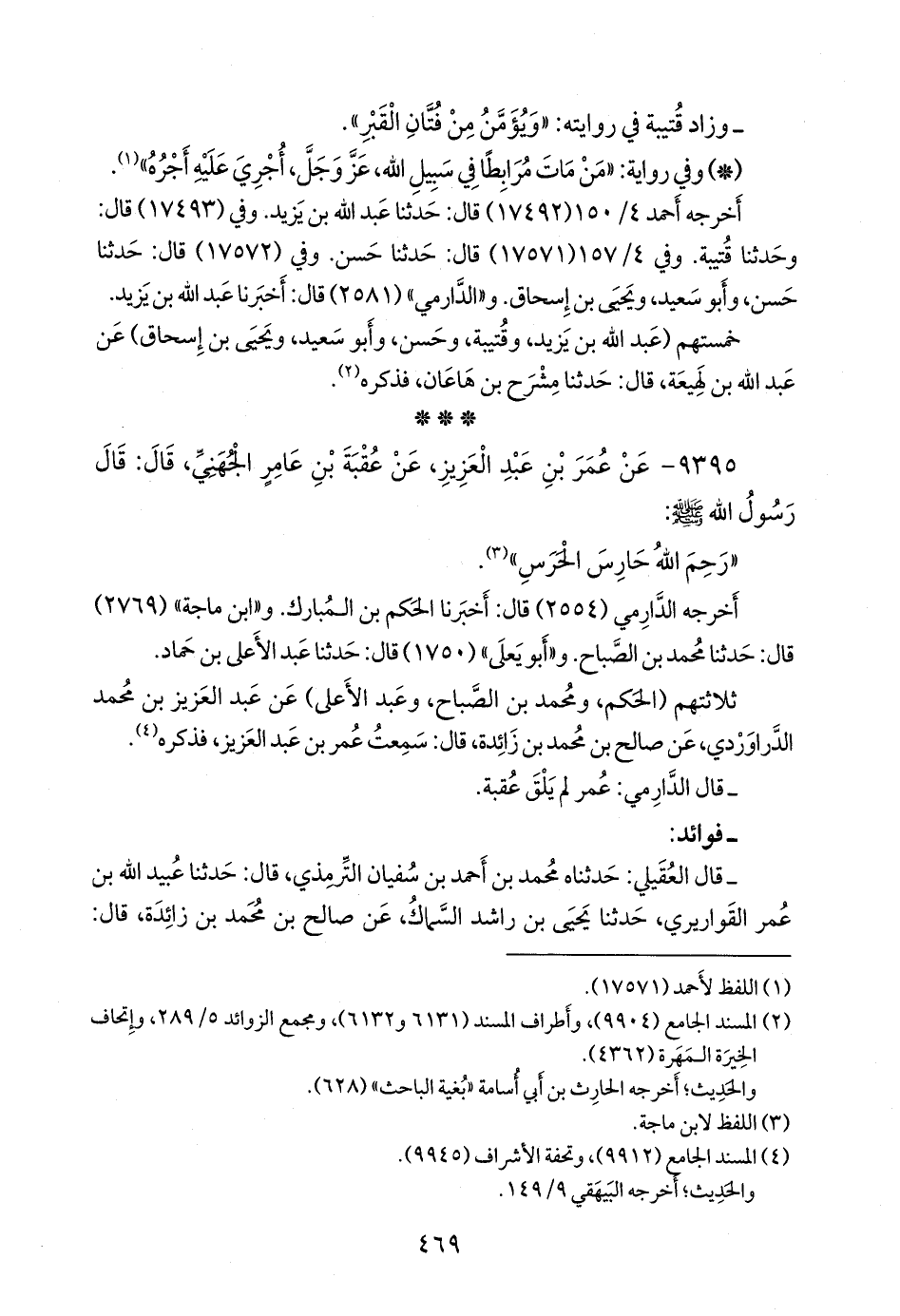 حدثنا أَبو يحيى بن أبي مَسَرَّة، قال: حدثنا يحيى بن محمد الجاري، وسعيد بن منصور، قالا: حدثنا عبد العزيز بن محمد الدراوَرْدي، قال: حدثنا صالح بن محمد بن زائدة، قال: حدثنا عمر بن عبد العزيز، عن عقبة بن عامر، عن النبي صَلى الله عَليه وسَلم قال: رحم الله حارس الحرس.