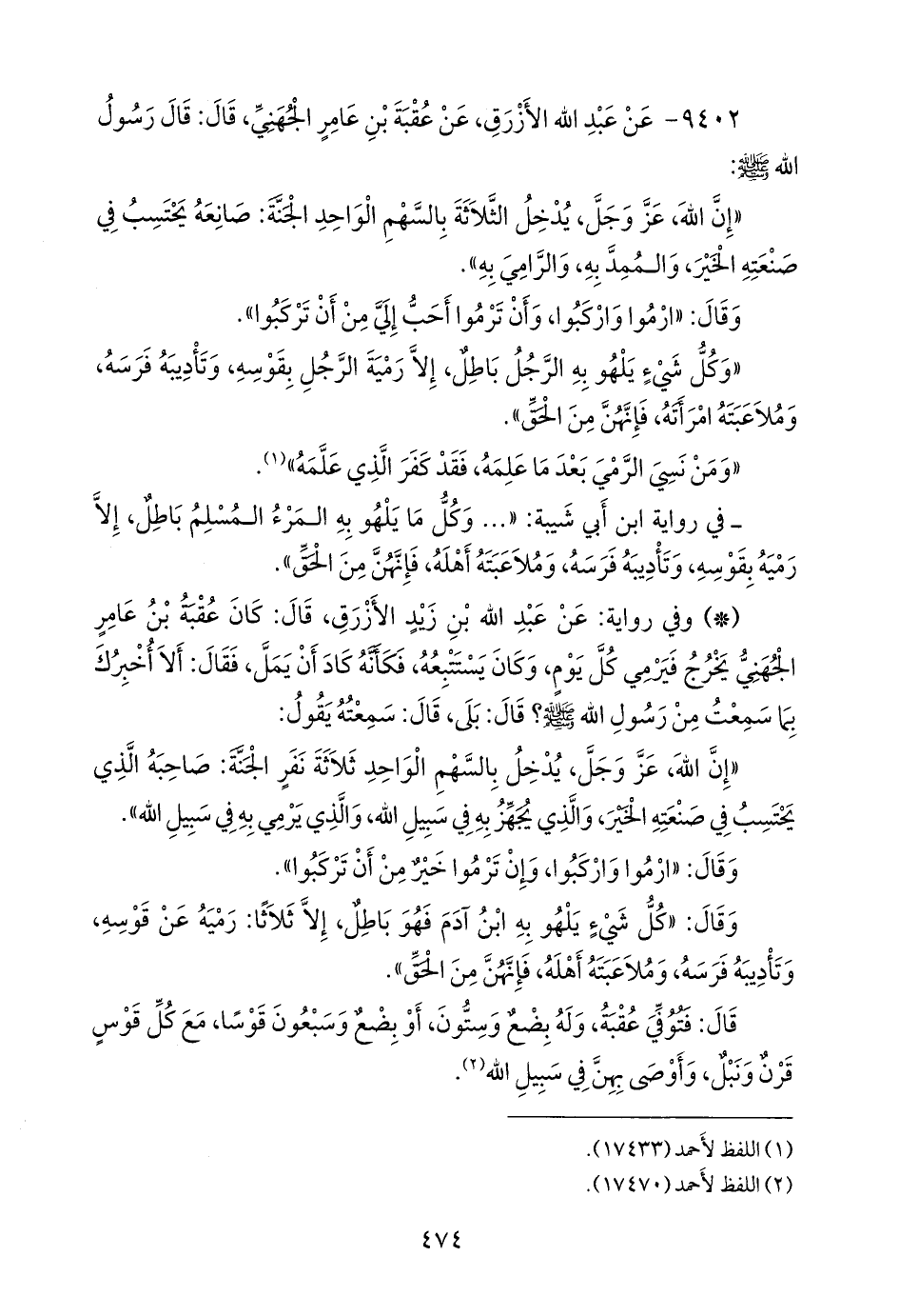 - في رواية ابن أبي شيبة: «وكل ما يلهو به المرء المسلم باطل، إلا رميه بقوسه، وتأديبه فرسه، وملاعبته أهله، فإنهن من الحق».
