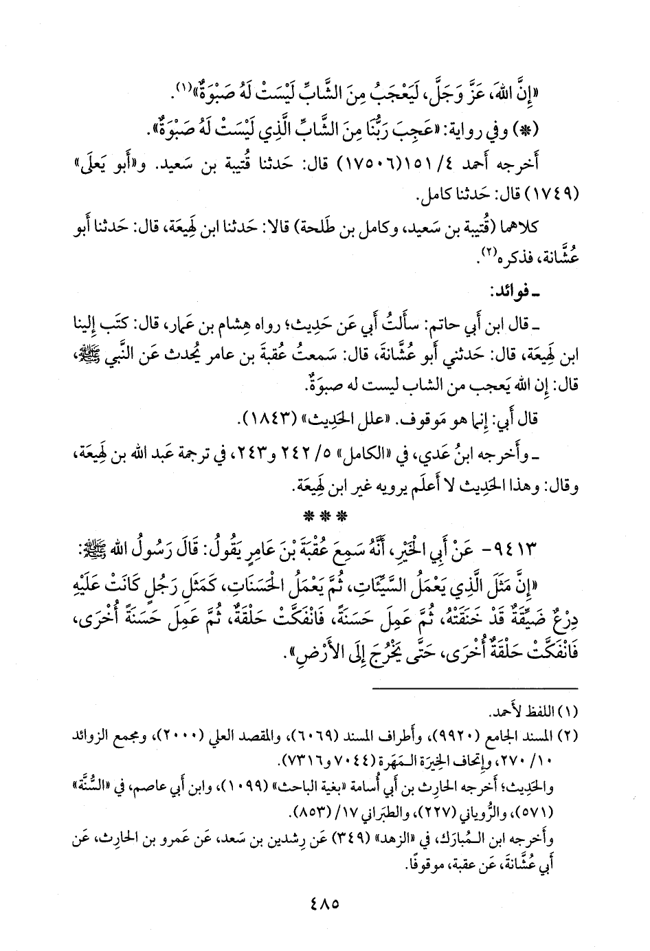 - وقال ابن أبي حاتم: سألت أبي عن ئحديث؛ رواه هشام بن عمار، قال: كتب إلينا ابن لَهِيعة، قال: حدثني أَبو عُشَّانَة، قال: سمعت عقبة بن عامر يحدث عن النبي صَلى الله عَليه وسَلم قال: إن الله يعجب من الشاب ليست له صبوة.