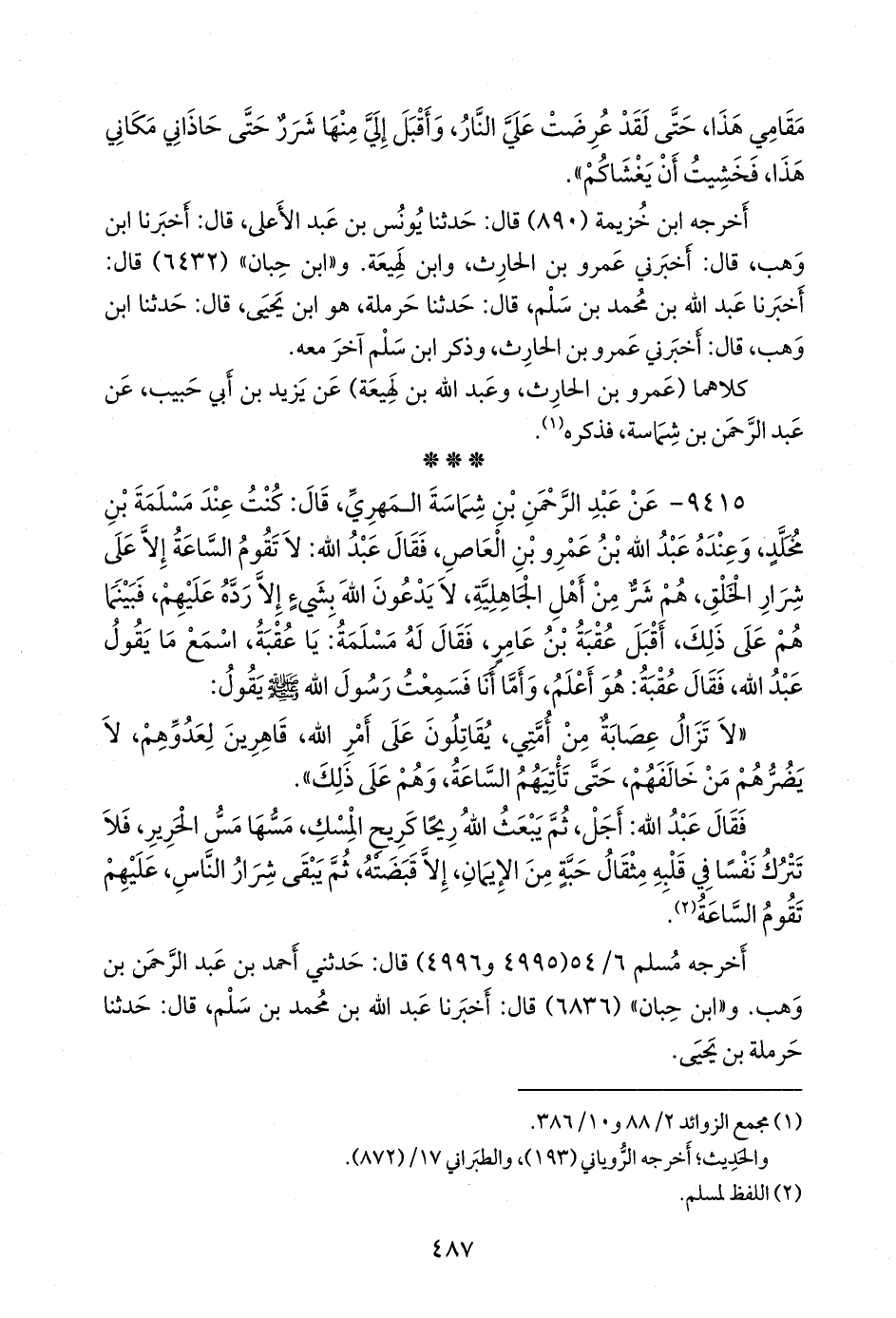 ٩٤١٥ - عن عبد الرَّحمَن بن شِمَاسة المهري، قال: كنت عند مَسلَمة بن مُخَلَّد، وعنده عبد الله بن عَمرو بن العاص، فقال عبد الله: لا تقوم الساعة إلا على شرار الخلق، هم شر من أهل الجاهلية، لا يدعون الله بشيء إلا رده عليهم، فبينما هم على ذلك، أقبل عقبة بن عامر، فقال له مسلمة: يا عقبة، اسمع ما يقول عبد الله، فقال عقبة: هو أعلم، وأما أنا فسمعت رسول الله صَلى الله عَليه وسَلم يقول: