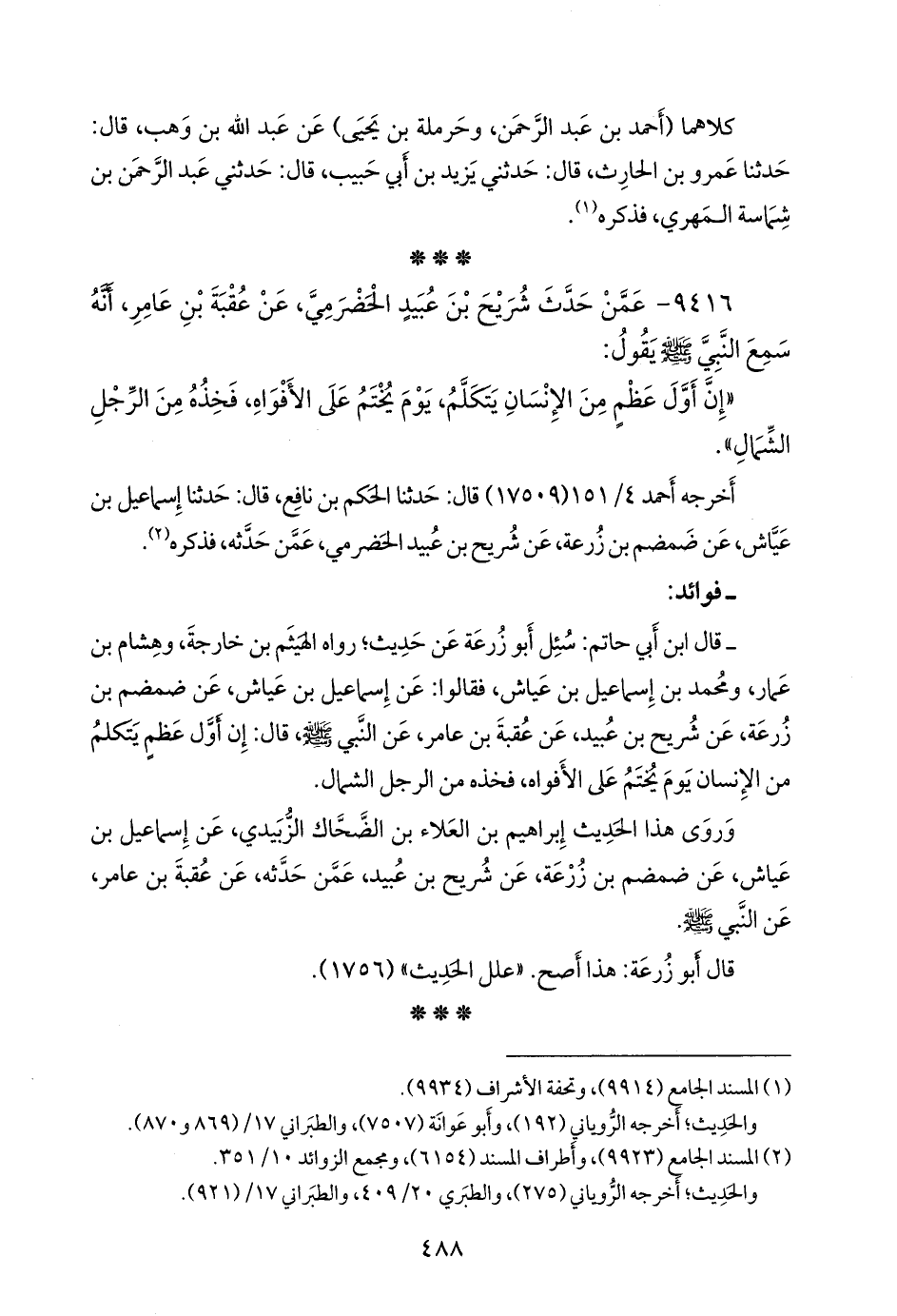 - وقال ابن أبي حاتم: سئل أَبو زُرعَة عن حديث؛ رواه الهيثم بن خارجة، وهشام بن عمار، ومحمد بن إسماعيل بن عياش، فقالوا: عن إسماعيل بن عياش، عن ضَمضَم بن زرعة، عن شريح بن عبيد، عن عقبة بن عامر، عن النبي صَلى الله عَليه وسَلم قال: إن أول عظم يتكلم من الإنسان يوم يختم على الأفواه، فخذه من الرجل الشمال.