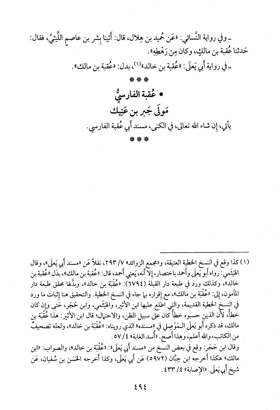 - وقال ابن حَجَر: وقع في بعض النسخ من «مسند أبي يَعلى»: «عقبة بن خالد»، والصواب: «ابن مالك» هكذا أخرجه ابن حِبَّان (٦٠٠٩) عن أبي يَعلى، وكذا أخرجه الحسن بن سفيان، عن شيخ أبي يَعلى. «الإصابة» ٧/ ٢١٤.