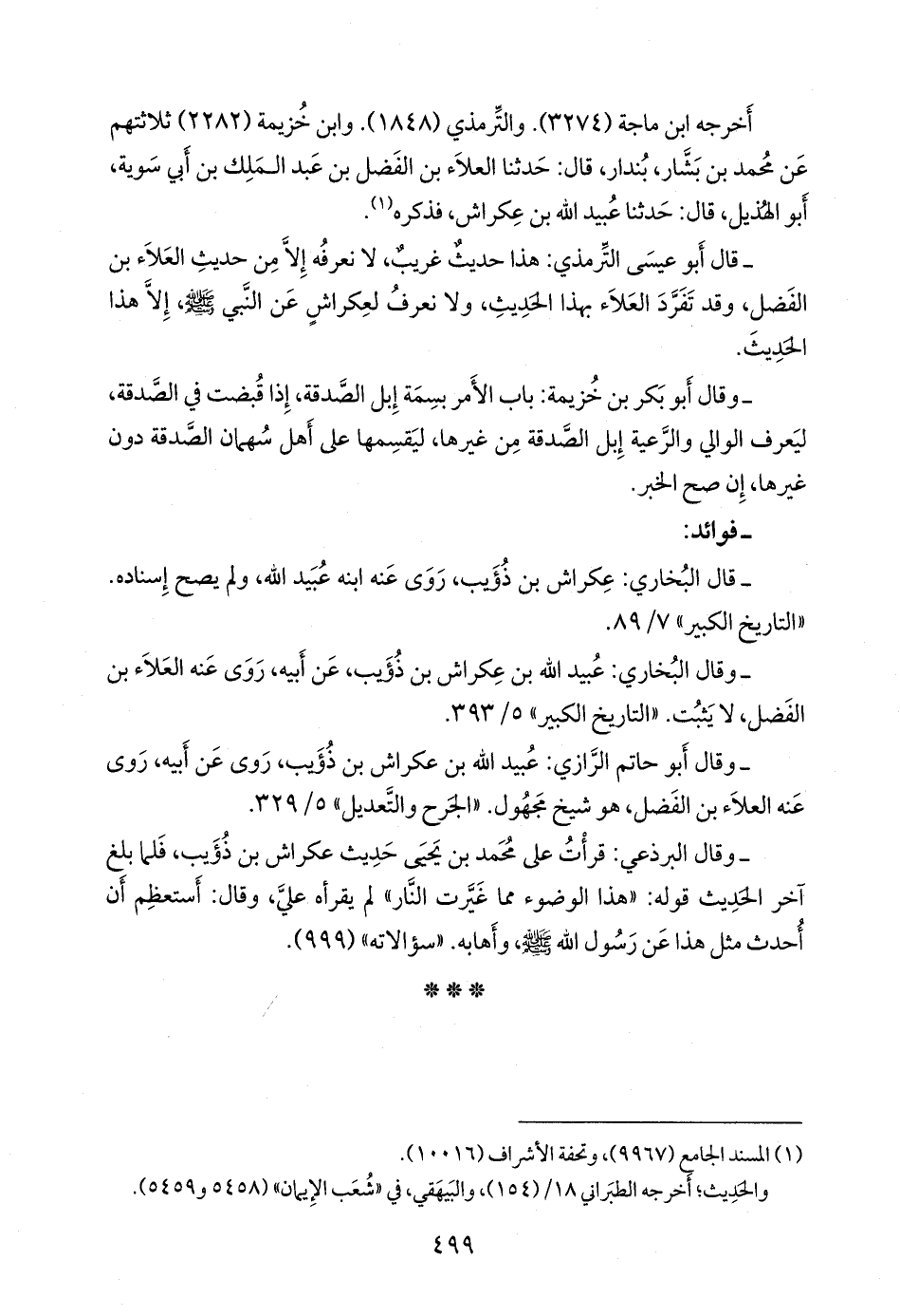 - قال الترمذي: هذا حديثٌ غريبٌ، لا نعرفه إِلا من حديث العلاء بن الفضل، وقد تفرد العلاء بهذا الحديث، (ولا نعرف لعكراش عن النبي صَلى الله عَليه وسَلم إلا هذا الحديث) (¬٢) , وفي الحديث قصة.