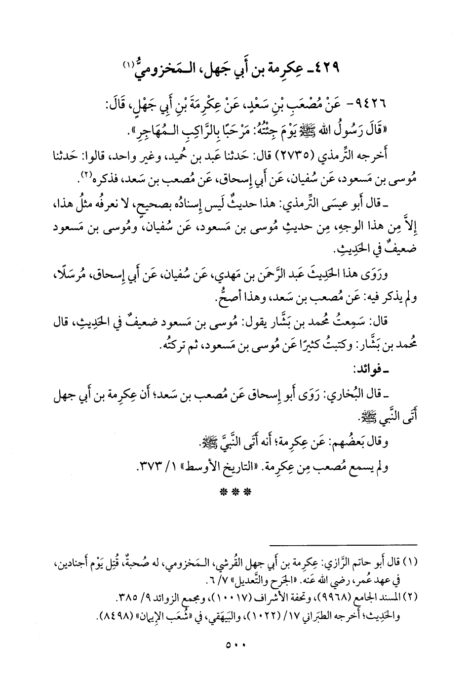 - قلنا: إِسناده ضعيفٌ؛ قال البخاري: روى أَبو إسحاق، عن مصعب بن سعد؛ أَن عِكرمة بن أَبي جهل أَتى النبي صَلى الله عَليه وسَلم.