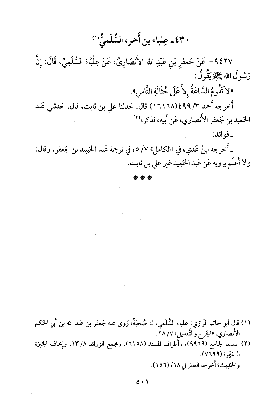 (¬١) قال أَبو حاتم الرازي: علباء السلمي، له صحبة، روى عنه جعفر بن عبد الله بن أبي الحكم الأَنصاري. «الجرح والتعديل» ٧/ ٢٨.