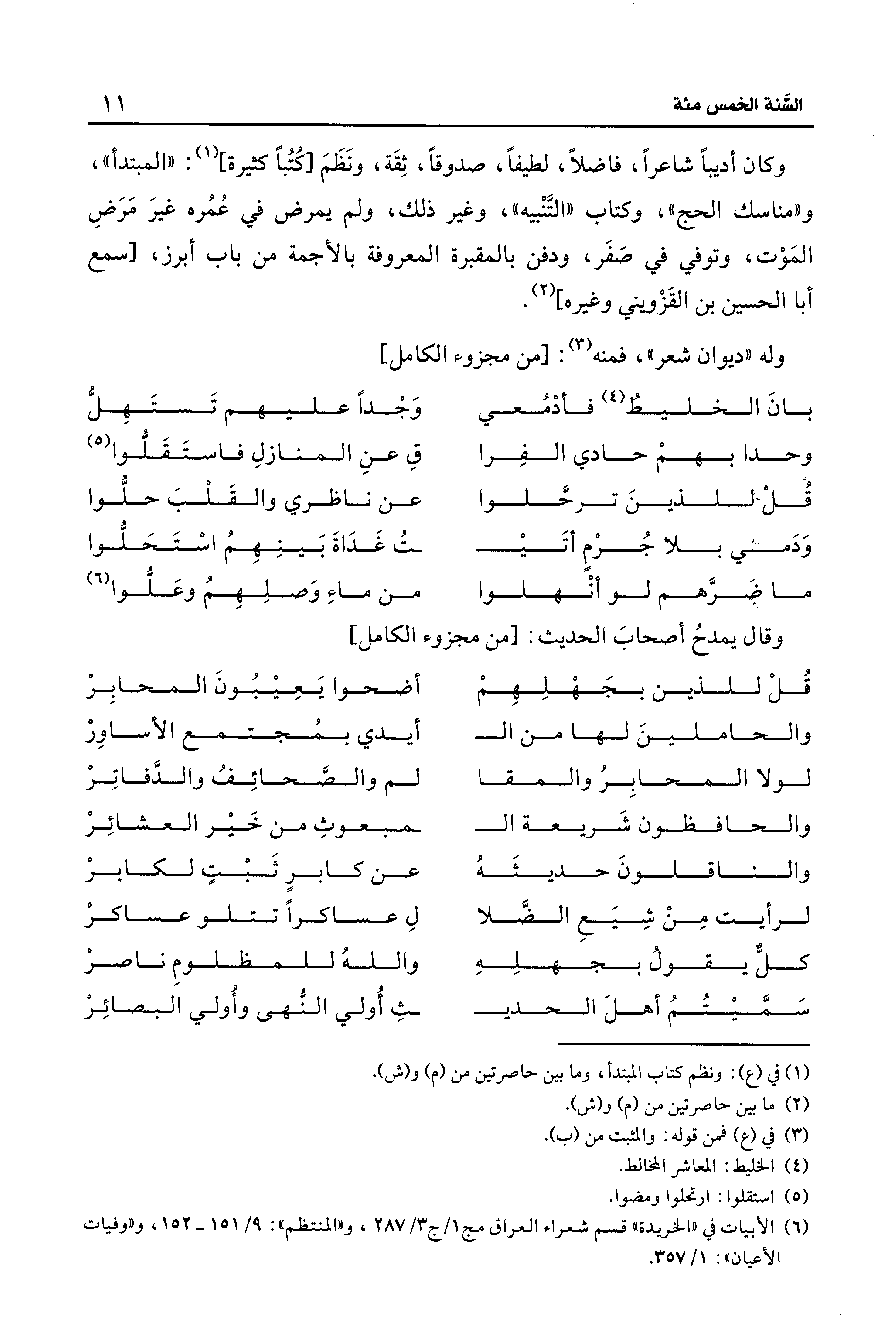 (¬6) الأبيات في "الخريدة" قسم شعراء العراق مج 1 / ج 3/ 287، و"المنتظم": 9/ 151 - 152، و"وفيات الأعيان": 1/ 357.