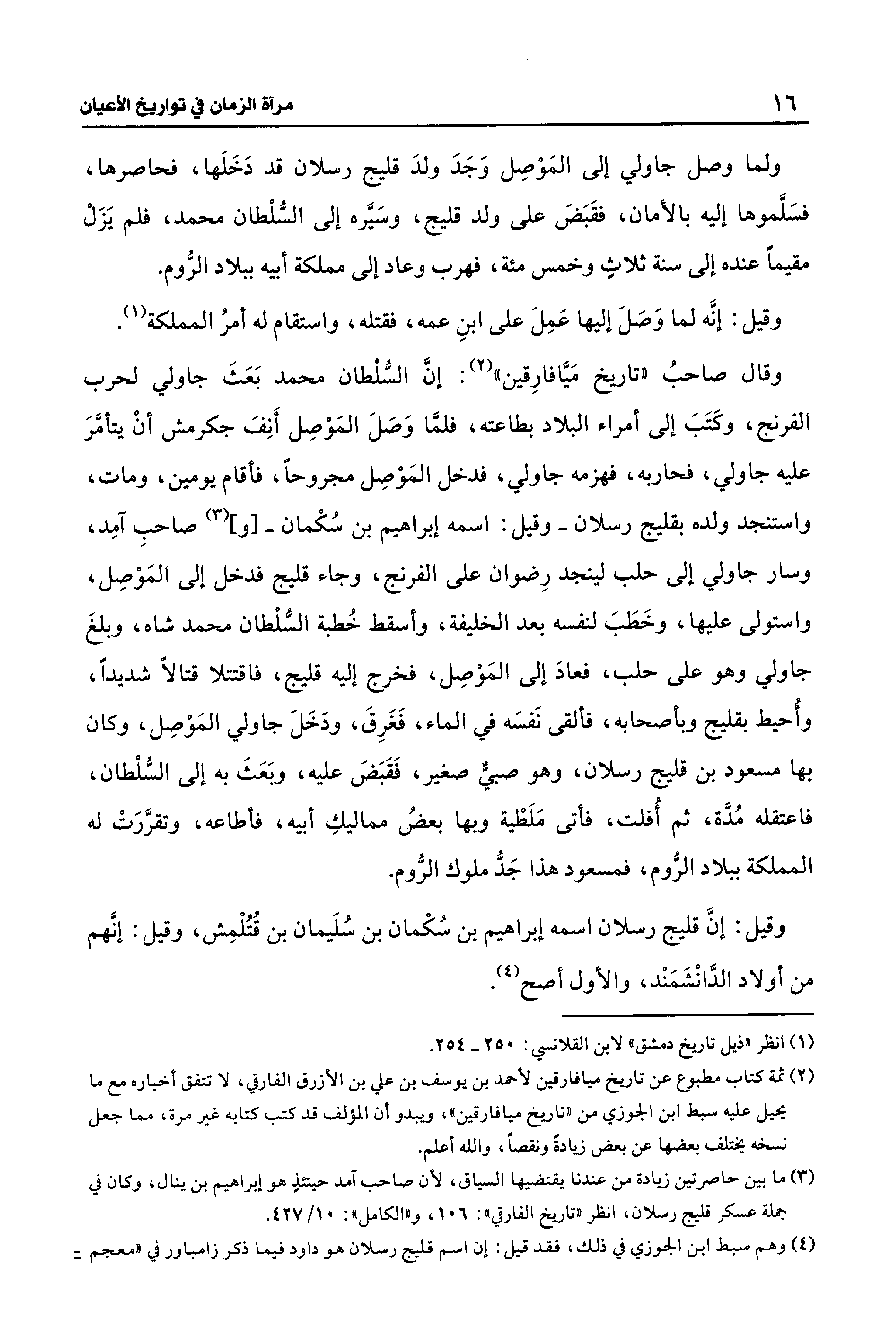 (¬2) ثمة كتاب مطبوع عن تاريخ ميافارقين لأحمد بن يوسف بن علي بن الأزرق الفارقي، لا تتفق أخباره مع ما يحيل عليه سبط ابن الجوزي من "تاريخ ميافارقين"، ويبدو أن المؤلف قد كتب كتابه غير مرة، مما جعل نسخه يختلف بعضها عن بعض زيادة ونقصًا، والله أعلم.