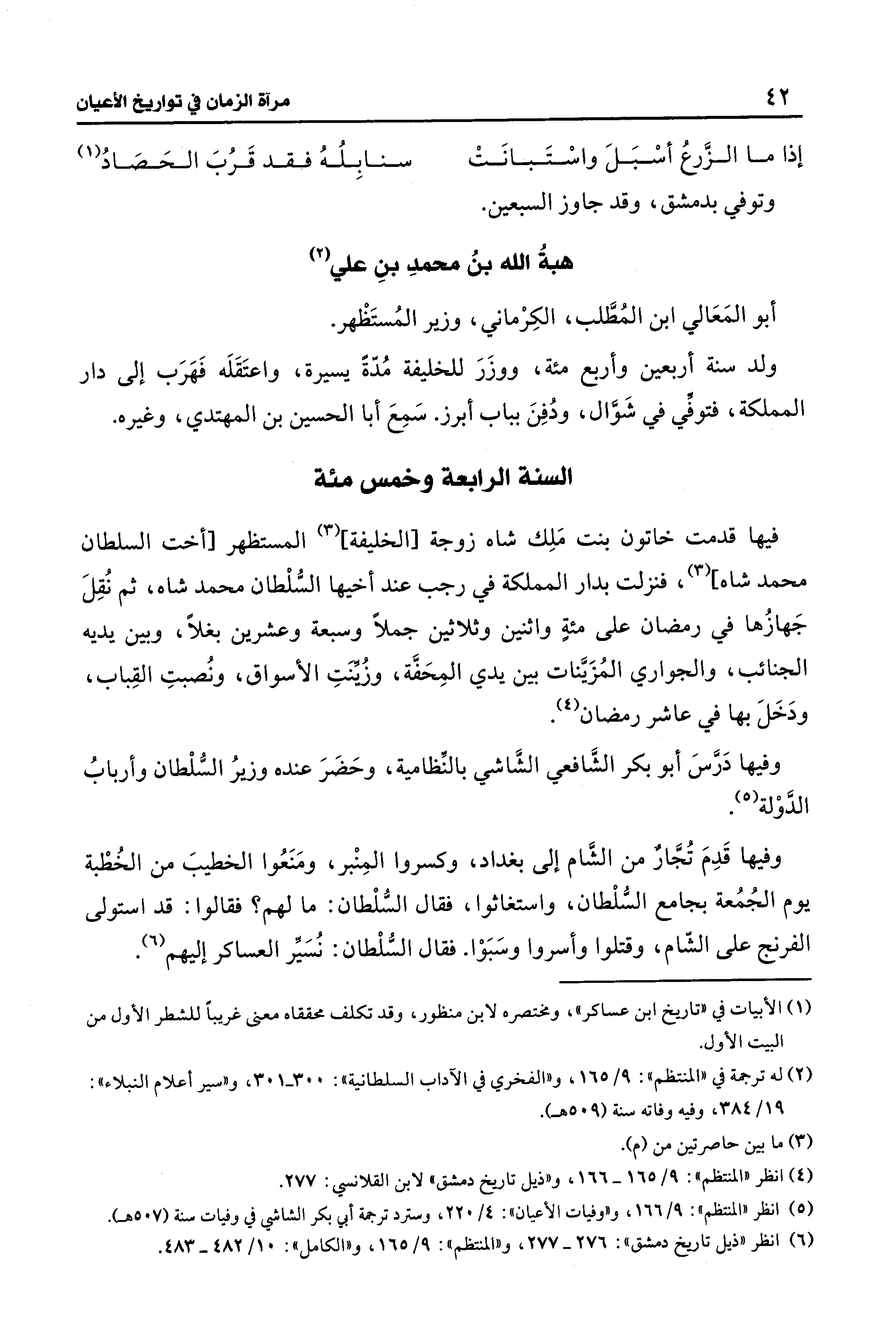 (¬6) انظر "ذيل تاريخ دمشق": 276 - 277، و"المنتظم": 9/ 165، و"الكامل": 10/ 482 - 483.