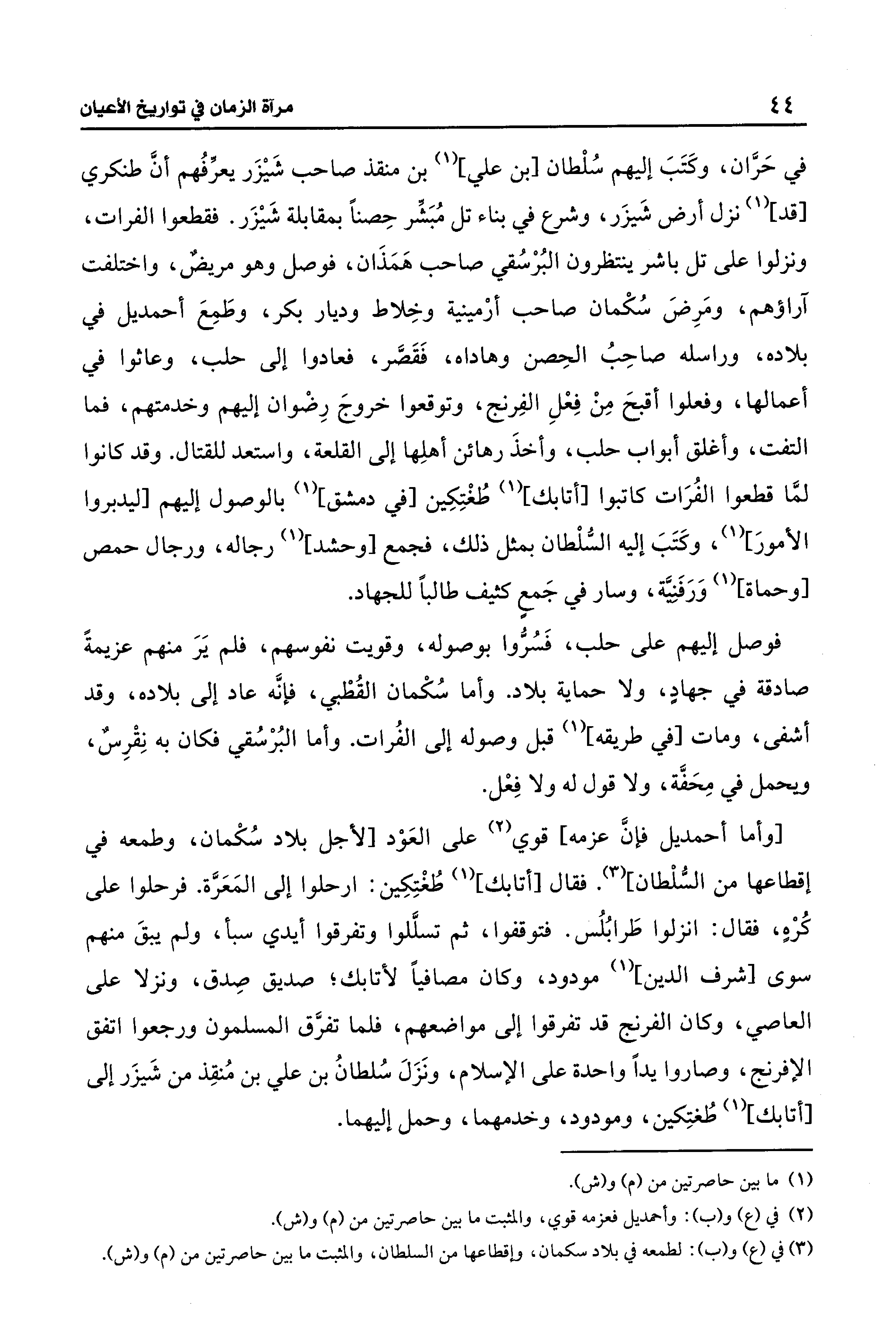 في حَرَّان، وكَتَبَ إليهم سُلْطان [بن عليّ] (1) بن منقذ صاحب شَيزَر يعرِّفُهم أنَّ طنكري [قد] (1) نزل أرض شَيزَر، وشرع في بناء تل مُبَشِّر حِصنًا بمقابلة شَيزَر. فقطعوا الفرات، ونزلوا على تل باشر ينتظرون البُرْسُقي صاحب هَمَذَان، فوصل وهو مريضٌ، واختلفت آراؤهم، ومَرِضَ سُكْمان صاحب أرْمينية وخِلاط وديار بكر، وطَمِعَ أحمديل في بلاده، وراسله صاحِبُ الحِصن وهاداه، فَقَصَّر، فعادوا إلى حلب، وعاثوا في أعمالها، وفعلوا أقبحَ مِنْ فِعْلِ الفِرنج، وتوقعوا خروجَ رِضْوان إليهم وخدمتهم، فما التفت، وأغلق أبواب حلب، وأخذَ رهائن أهلِها إلى القلعة، واستعد للقتال. وقد كانوا لمَّا قطعوا الفُرَات كاتبوا [أتابك] (1) طُغْتِكِين [في دمشق] (1) بالوصول إليهم [ليدبروا الأمورَ] (1)، وكَتَبَ إليه السُّلْطان بمثل ذلك، فجمع [وحشد] (1) رجاله، ورجال حمص [وحماة] (1) وَرَفنِيَّة، وسار في جَمع كثيف طالبًا للجهاد.