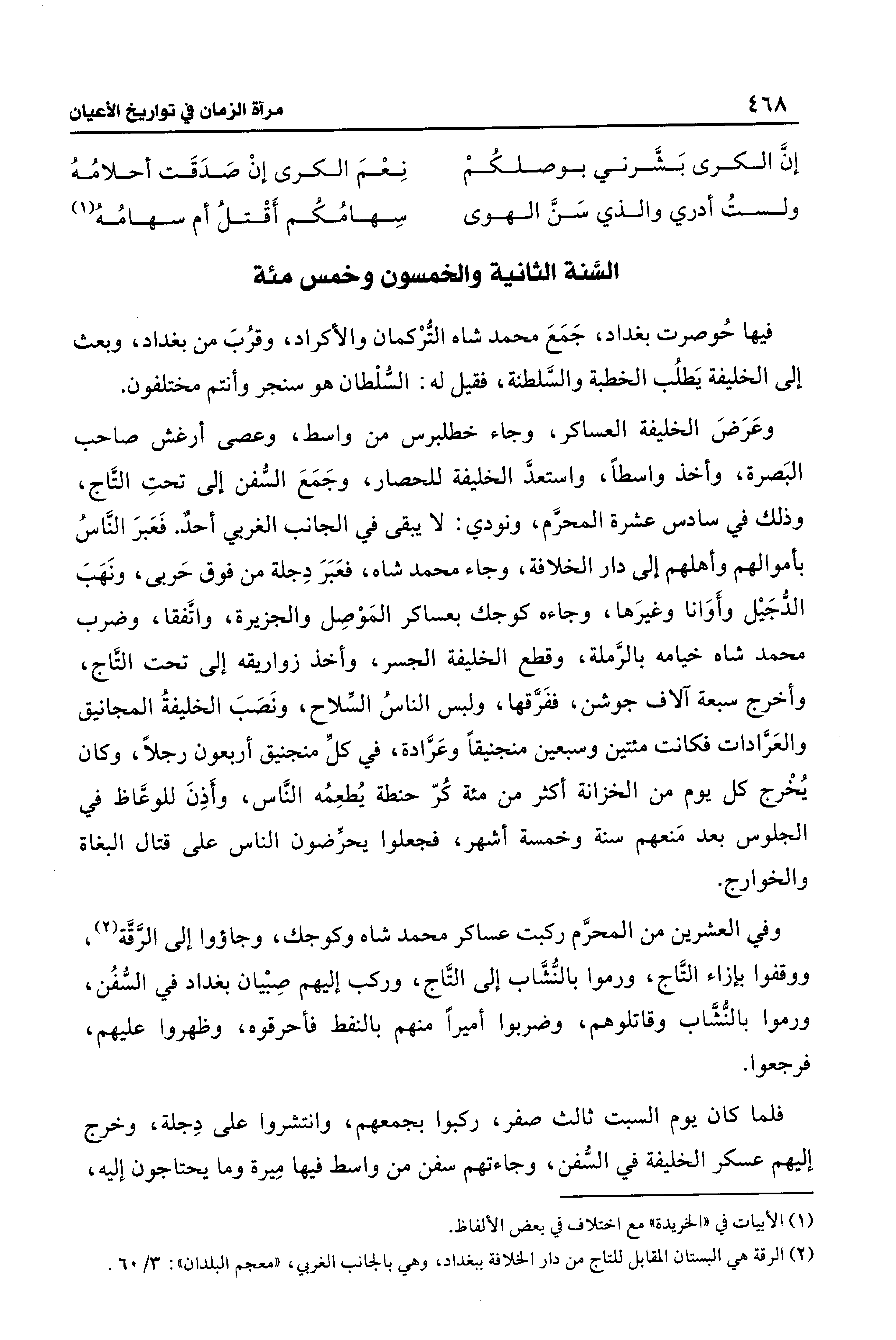 وفي العشرين من المحرَّم ركبت عساكر محمد شاه وكوجك، وجاؤوا إلى الرَّقَّة (¬2)، ووقفوا بإزاء التَّاج، ورموا بالنُّشَّاب إلى التَّاج، وركب إليهم صِبْيان بغداد في السُّفُن، ورموا بالنُّشَّاب وقاتلوهم، وضربوا أميرًا منهم بالنفط فأحرقوه، وظهروا عليهم، فرجعوا.