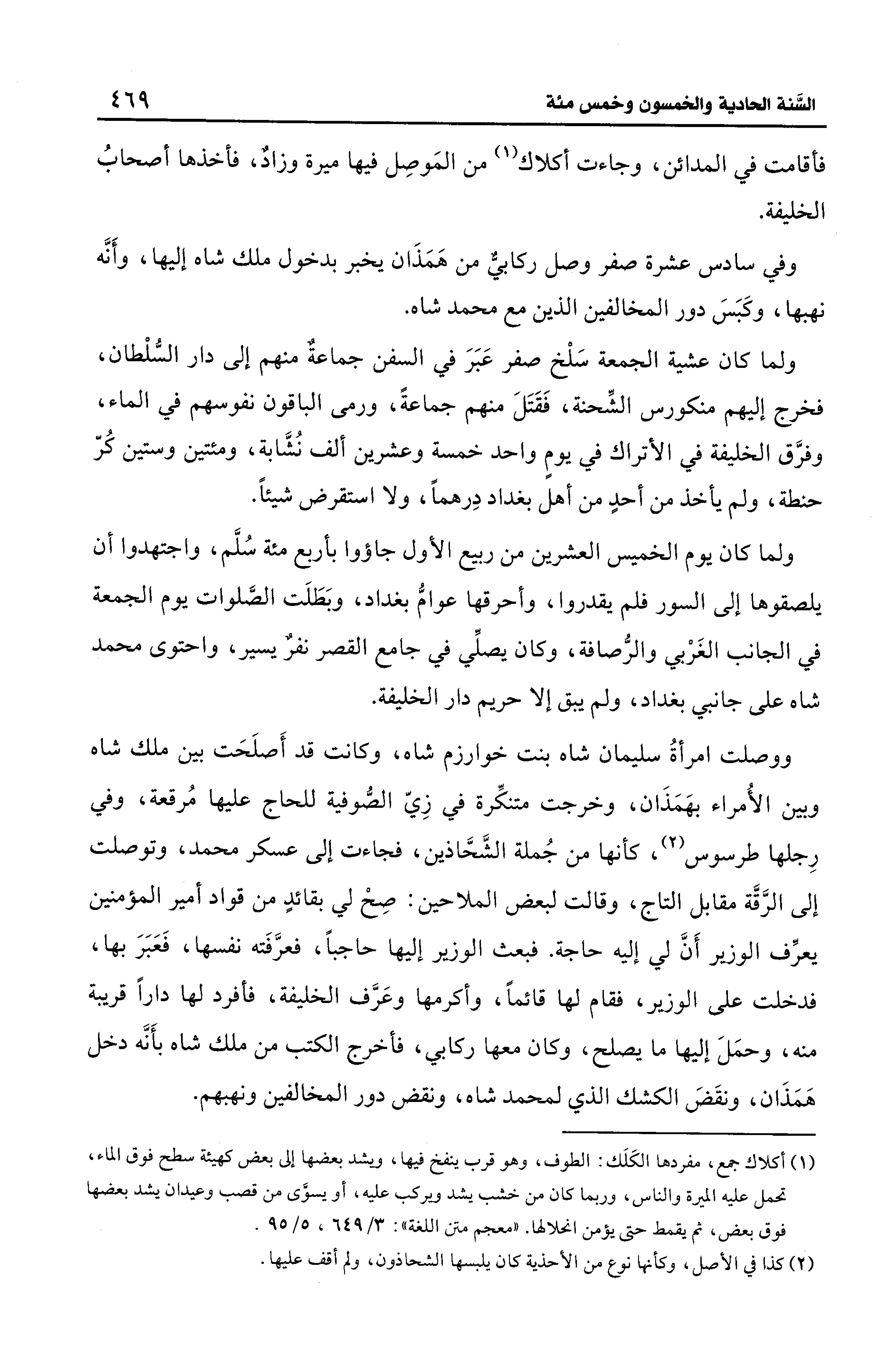 ووصلت امرأةُ سليمان شاه بنت خوارزم شاه، وكانت قد أَصلَحَت بين ملك شاه وبين الأُمراء بهَمَذَان، وخرجت متنكِّرة في زِيّ الصُّوفية للحاج عليها مُرقعة، وفي رِجلها طرسوس (¬2)، كأنها من جُملة الشَّحَّاذين، فجاءت إلى عسكر محمد، وتوصلت إلى الرَّقَّة مقابل التاج، وقالت لبعض الملاحين: صِحْ لي بقائدٍ من قواد أمير المؤمنين يعرِّف الوزير أَنَّ لي إليه حاجة. فبعث الوزير إليها حاجبًا، فعرَّفَته نفسها، فَعَبَرَ بها، فدخلت على الوزير، فقام لها قائمًا، وأكرمها وعَرَّف الخليفة، فأفرد لها دارًا قريبة منه، وحمَلَ إليها ما يصلح، وكان معها ركابي، فأخرج الكتب من ملك شاه بأَنَّه دخل هَمَذَان، ونقَضَ الكشك الذي لمحمد شاه، ونقض دور المخالفين ونهبهم.