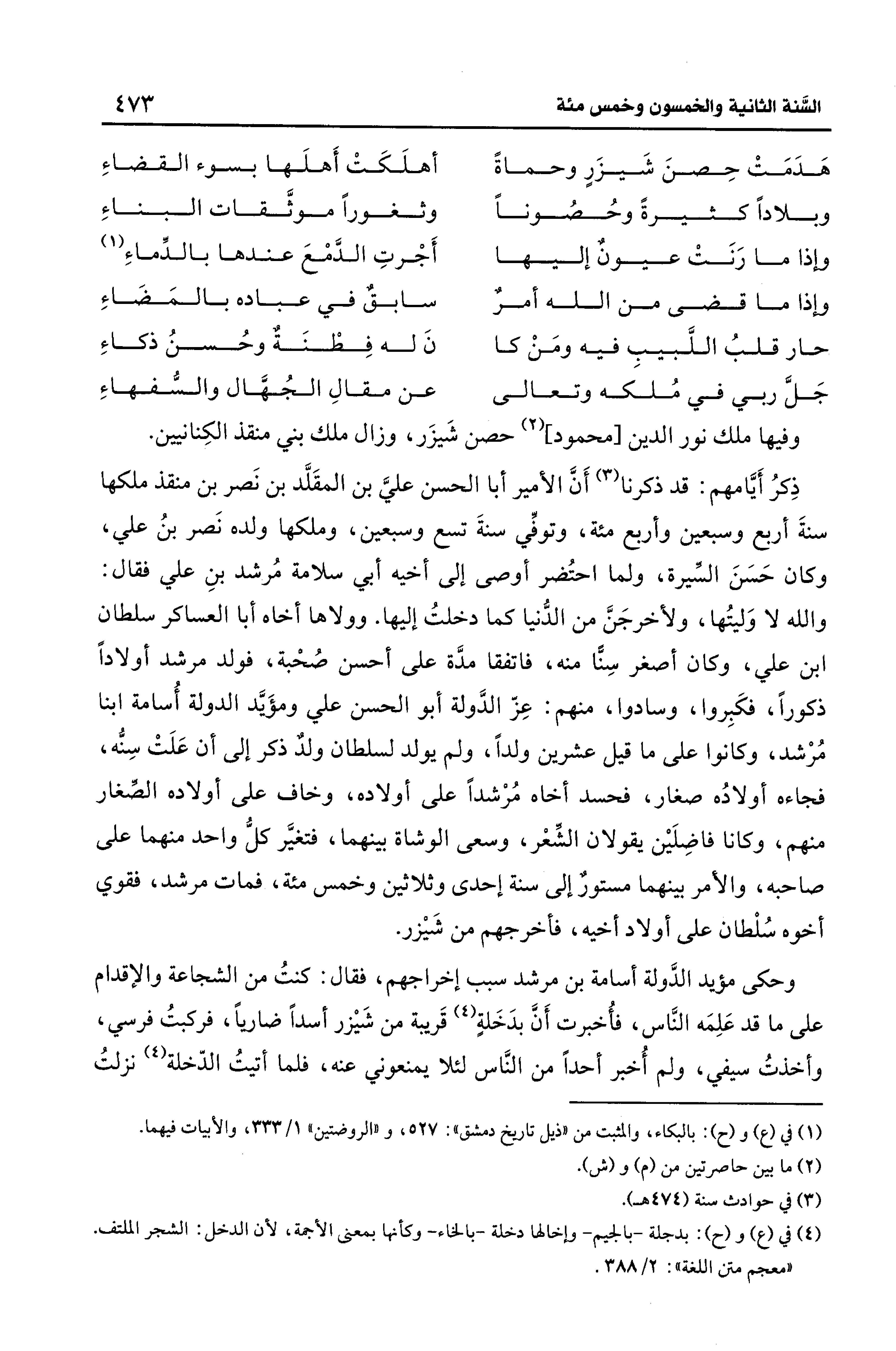 ذِكرُ أَيَّامهم: قد ذكرنا (¬3) أَنَّ الأمير أبا الحسن عليَّ بن المقَلَّد بن نَصر بن منقذ ملكها سنةَ أربع وسبعين وأربع مئة، وتوفِّي سنةَ تسع وسبعين، وملكها ولده نَصر بنُ علي، وكان حَسَنَ السِّيرة، ولما احتُضر أوصى إلى أخيه أبي سلامة مُرشد بنِ علي فقال: والله لا وَليتُها، ولأخرجَنَّ من الدُّنيا كما دخلتُ إليها. وولاها أخاه أبا العساكر سلطان بن علي، وكان أصغر سِنًّا منه، فاتفقا مدَّة على أحسن صحْبة، فولد مرشد أولادًا ذكورًا، فكَبِروا، وسادوا، منهم: عِزّ الدَّولة أبو الحسن علي ومؤَيَّد الدولة أُسامة ابنا مُرْشد، وكانوا على ما قيل عشرين ولدًا، ولم يولد لسلطان ولدٌ ذكر إلى أن عَلَتْ سِنُّه، فجاءه أولادُه صغار، فحسد أخاه مُرْشدًا على أولاده، وخاف على أولاده الصِّغار منهم، وكانا فاضِلَين يقولان الشِّعْر، وسعى الوشاة بينهما، فتغيَّر كلُّ واحد منهما على صاحبه، والأمر بينهما مستورٌ إلى سنة إحدى وثلاثين وخمس مئة، فمات مرشد، فقوي أخوه سُلْطان على أولاد أخيه، فأخرجهم من شَيزر.