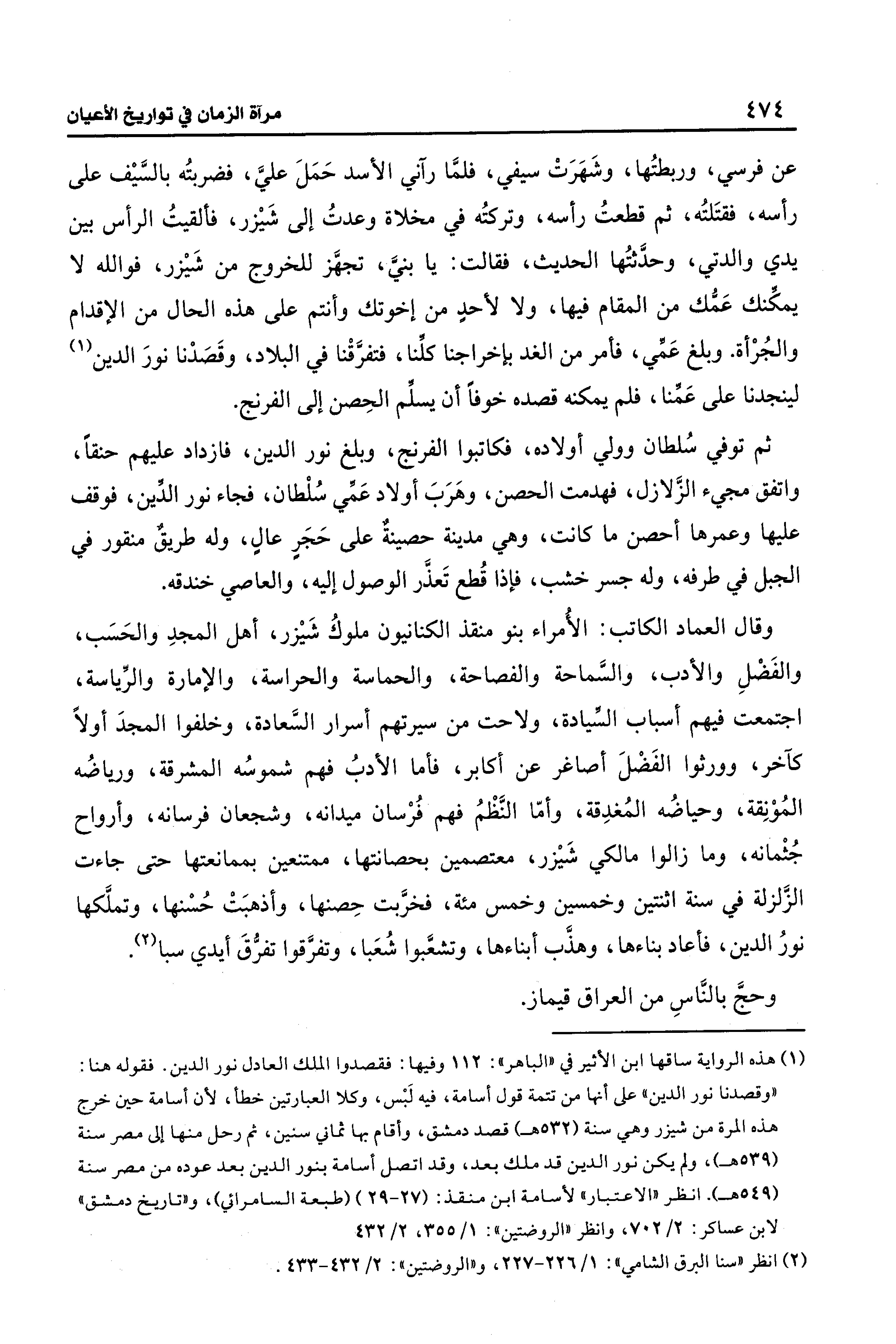 (¬1) هذه الرواية ساقها ابن الأثير في "الباهر": 112 وفيها: فقصدوا الملك العادل نور الدين. فقوله هنا: "وقصدنا نور الدين" على أنها من تتمة قول أسامة، فيه لَبْس، وكلا العبارتين خطأ، لأن أسامة حين خرج هذه المرة من شيزر وهي سنة (532 هـ) قصد دمشق، وأقام بها ثماني سنين، ثم رحل منها إلى مصر سنة (539 هـ)، ولم يكن نور الدين قد ملك بعد، وقد اتصل أسامة بنور الدين بعد عوده من مصر سنة (549 هـ). انظر "الاعتبار" لأسامة بن منقذ: (27 - 29) (طبعة السامرائي)، و"تاريخ دمشق" لابن عساكر: 2/ 702، وانظر "الروضتين": 1/ 355، 2/ 432.