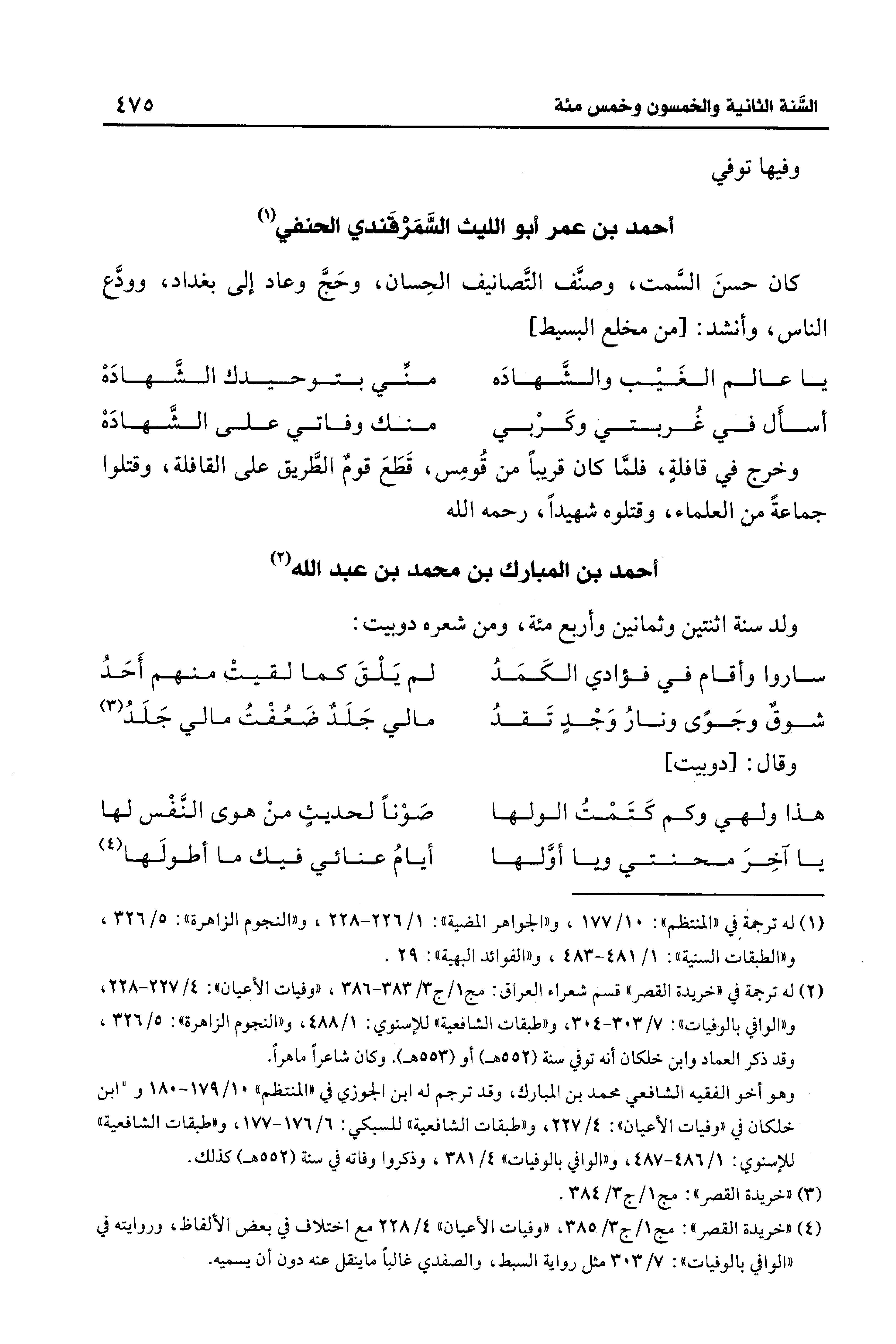 (¬2) له ترجمة في "خريدة القصر" قسم شعراء العراق: مج 1 / ج 3/ 383 - 386، "وفيات الأعيان": 4/ 227 - 228، و"الوافي بالوفيات": 7/ 303 - 304، و"طبقات الشافعية" للإسنوي: 1/ 488، و"النجوم الزاهرة": 5/ 326، وقد ذكر العماد وابن خلكان أنه توفي سنة (552 هـ) أو (553 هـ). وكان شاعرًا ماهرًا.