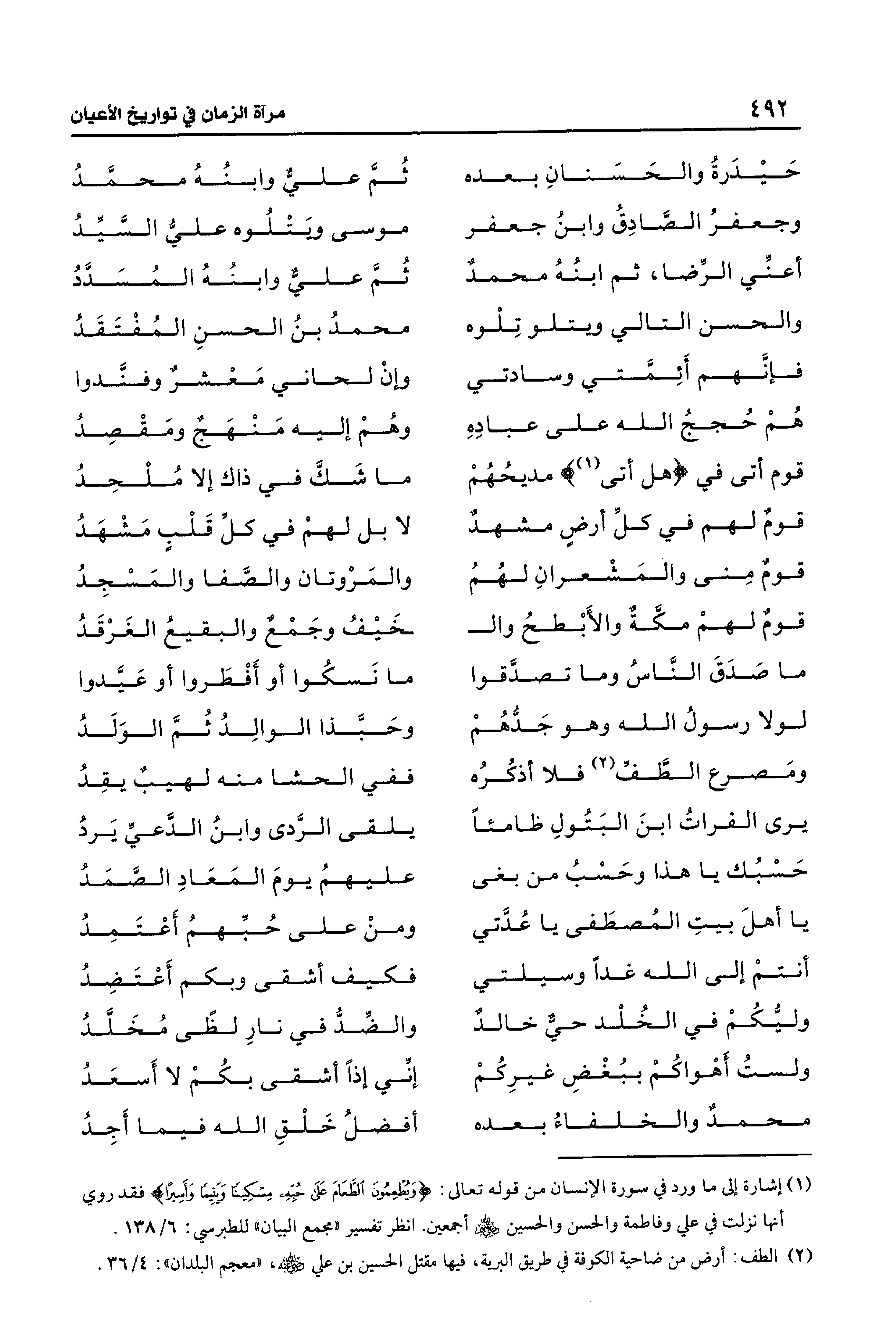 (¬1) إشارة إلى ما ورد في سورة الإنسان من قوله تعالى: {وَيُطْعِمُونَ الطَّعَامَ عَلَى حُبِّهِ مِسْكِينًا وَيَتِيمًا وَأَسِيرًا} فقد روي أنها نزلت في علي وفاطمة والحسن والحسين - رضي الله عنهم - أجمعين. انظر تفسير "مجمع البيان" للطبرسي: 6/ 138.