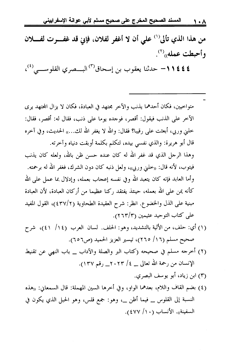 -[109]- حدثنا عمرو بن عاصم (¬3)، حدثنا معتمر (¬4)، عن أبيه، عن أبي عمران، عن جندب، أن النبي -صلى الله عليه وسلم- حدثه: "أن رجلا قال: والله لا يغفر الله لفلان، وأن الله عز وجل قال: من ذا الذي يتألى علي أن لا أغفر لفلان، فإني قد غفرت لفلان، وأحبطت عمله" (¬5).