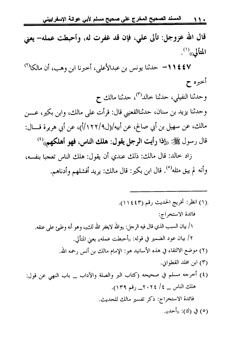 وحدثنا يزيد بن سنان، حدثنا القعنبي قال: قرأت على مالك، وابن بكير، عن مالك، عن سهيل بن أبي صالح، عن أبيه، عن أبي هريرة قال: قال رسول -صلى الله عليه وسلم-: "إذا رأيت الرجل يقول: هلك الناس، فهو أهلكهم" (¬3).