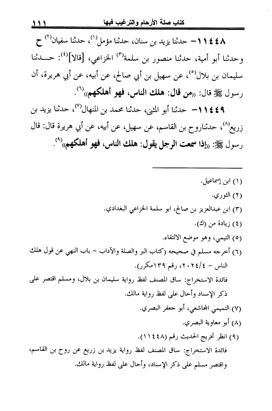 (¬6) أخرجه مسلم في صحيحه (كتاب البر والصلة والآداب -باب النهي عن قول هلك الناس- 4/ 2024، رقم 139 مكرر).