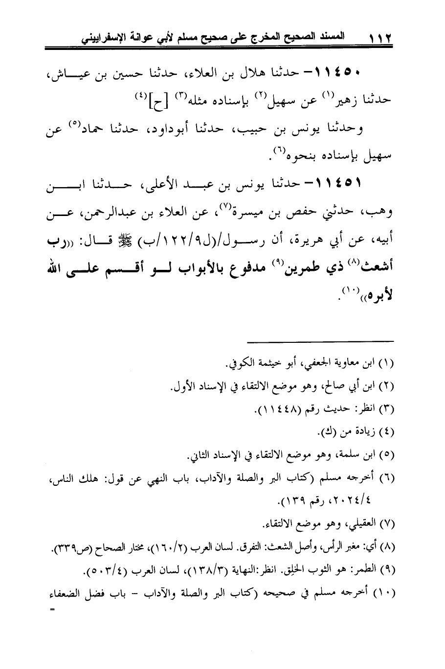 11451 - حدثنا يونس بن عبد الأعلى، حدثنا ابن وهب، حدثني حفص بن ميسرة (¬1)، عن العلاء بن عبد الرحمن، عن أبيه، عن أبي هريرة، أن رسول -صلى الله عليه وسلم- قال: "رب أشعث (¬2) ذي طمرين (¬3) مدفوع بالأبواب لو أقسم على الله لأبره" (¬4).