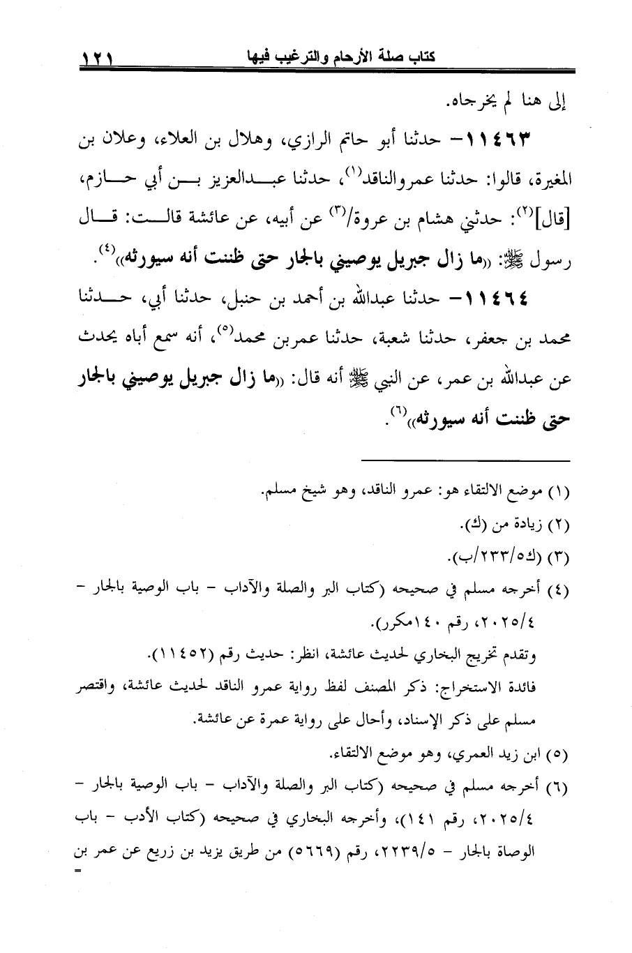 11463 - حدثنا أبو حاتم الرازي، وهلال بن العلاء، وعلان بن المغيرة، قالوا: حدثنا عمرو الناقد (¬1)، حدثنا عبد العزيز بن أبي حازم، [قال] (¬2): حدثني هشام بن عروة (¬3) عن أبيه، عن عائشة قالت: قال رسول -صلى الله عليه وسلم-: "ما زال جبريل يوصيني بالجار حتى ظننت أنه سيورثه" (¬4).