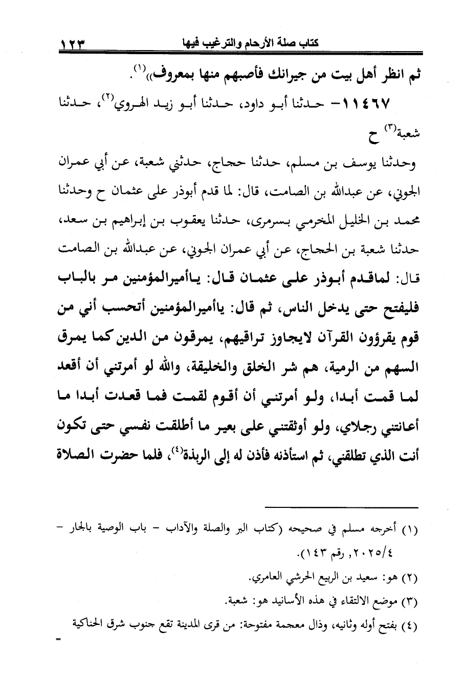 وحدثنا يوسف بن مسلم، حدثنا حجاج، حدثني شعبة، عن أبي عمران الجوني، عن عبد الله بن الصامت، قال: لما قدم أبو ذر على عثمان ح وحدثنا محمد بن الخليل المخرمي بسرمرى، حدثنا يعقوب بن إبراهيم بن سعد، حدثنا شعبة بن الحجاج، عن أبي عمران الجوني، عن عبد الله بن الصامت قال: لما قدم أبو ذر على عثمان قال: يا أمير المؤمنين مر بالباب فليفتح حتى يدخل الناس، ثم قال: يا أمير المؤمنين أتحسب أني من قوم يقرؤون القرآن لا يجاوز تراقيهم، يمرقون من الدين كما يمرق السهم من الرمية، هم شر الخلق والخليقة، والله لو أمرتني أن أقعد لما قمت أبدًا، ولو أمرتني أن أقوم لقمت فما قعدت أبدًا ما أعانتني رجلاي، ولو أوثقتني على بعير ما أطلقت نفسي حتى تكون أنت الذي تطلقني، ثم استأذنه فأذن له إلى الربذة (¬3)، فلما حضرت الصلاة