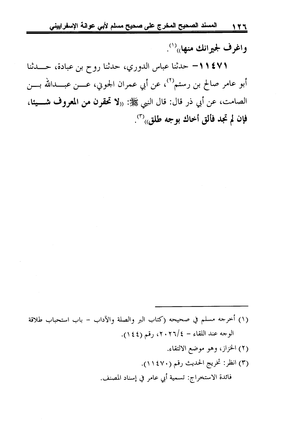 11471 - حدثنا عباس الدوري، حدثنا روح بن عبادة، حدثنا أبو عامر صالح بن رستم (¬1)، عن أبي عمران الجوني، عن عبد الله بن الصامت، عن أبي ذر قال: قال النبي -صلى الله عليه وسلم-: "لا تحقرن من المعروف شيئًا، فإن لم تجد فألق أخاك بوجه طلق" (¬2).
