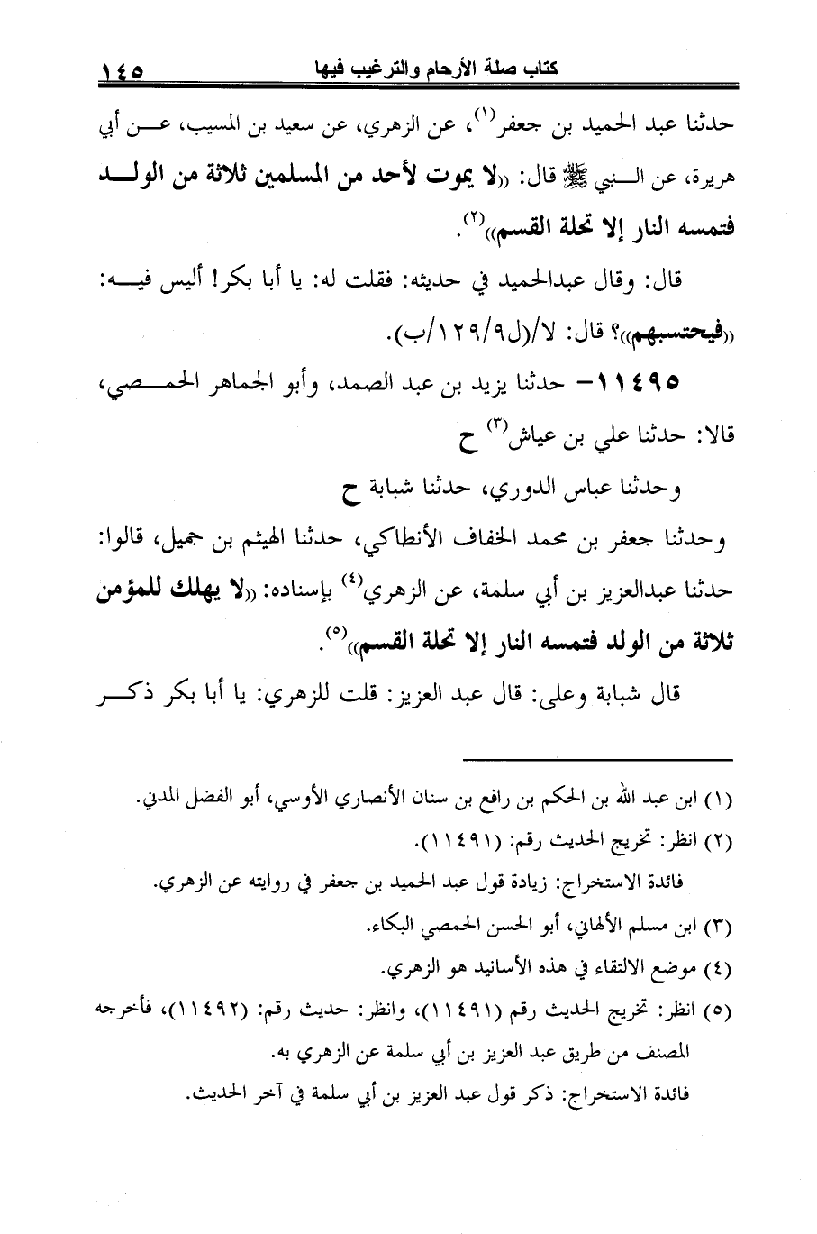 وحدثنا جعفر بن محمد الخفاف الأنطاكي، حدثنا الهيثم بن جميل، قالوا: حدثنا عبد العزيز بن أبي سلمة، عن الزهري (¬2) بإسناده: "لا يهلك للمؤمن ثلاثة من الولد فتمسه النار إلا تحلة القسم" (¬3).