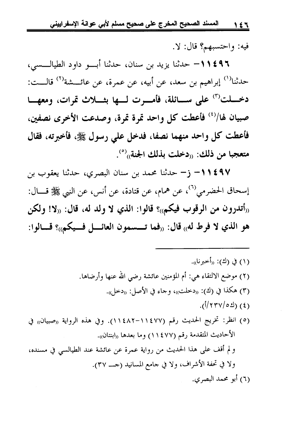11496 - حدثنا يزيد بن سنان، حدثنا أبو داود الطيالسي، حدثنا (¬1) إبراهيم بن سعد، عن أبيه، عن عمرة، عن عائشة (¬2) قالت: دخلت (¬3) على سائلة، فأمرت لها بثلاث تمرات، ومعها صبيان لها (¬4) فأعطت كل واحد تمرة تمرة، وصدعت الأخرى نصفين، فأعطت كل واحد منهما نصفا، فدخل علي رسول -صلى الله عليه وسلم-، فأخبرته، فقال متعجبًا من ذلك: "دخلت بذلك الجنة" (¬5).